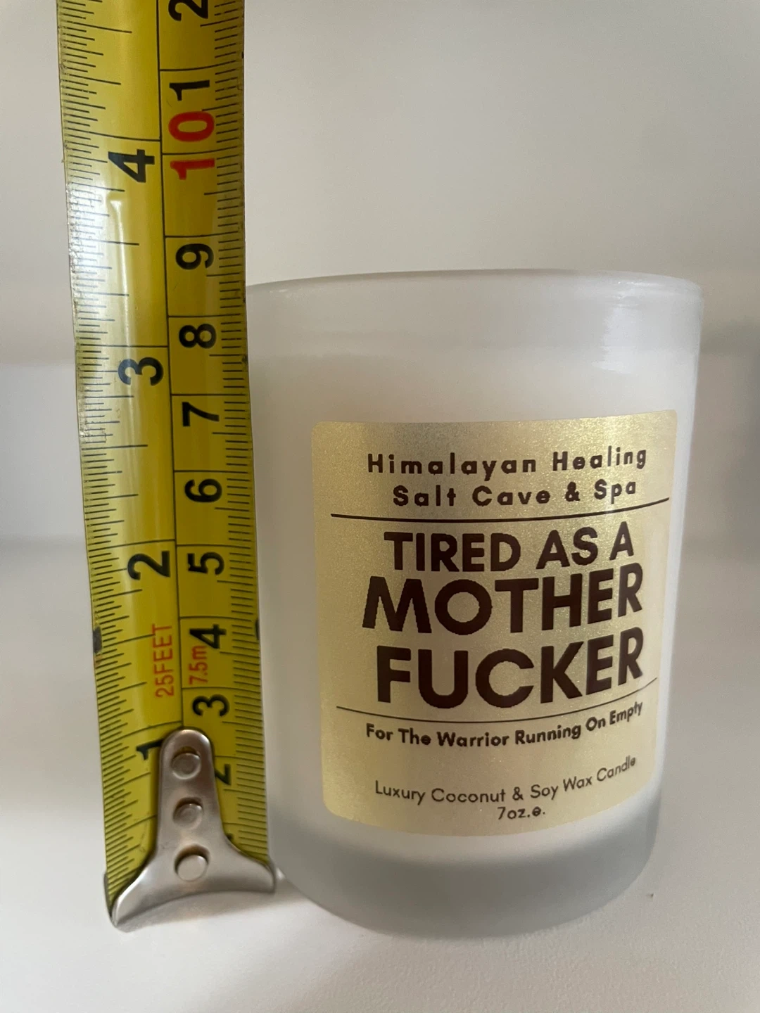 Himalayan Healing Salt Cave & Spa luxury coconut & soy wax candle. It's labeled 'Tired as a Mother F*cker' and is for the warrior running on empty.