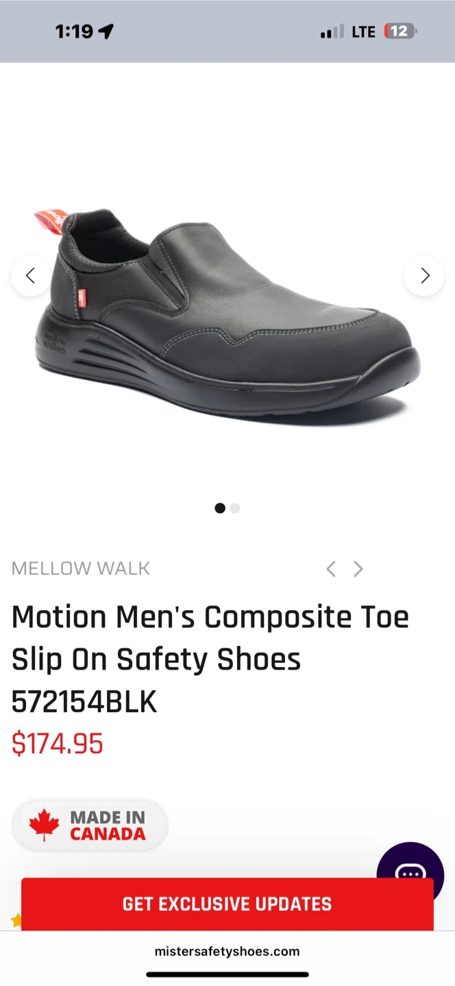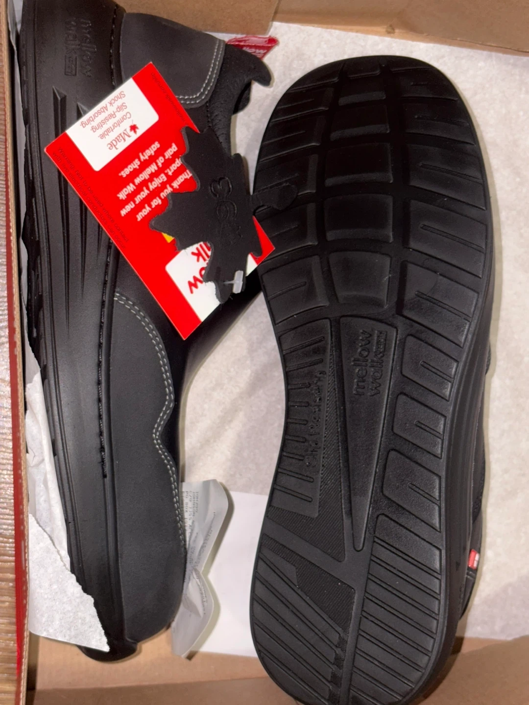 Selling a pair of Mellow Walk Motion men's composite toe slip-on safety shoes in black. They're brand new and come in the original box. Originally bought for $196 including taxes.
