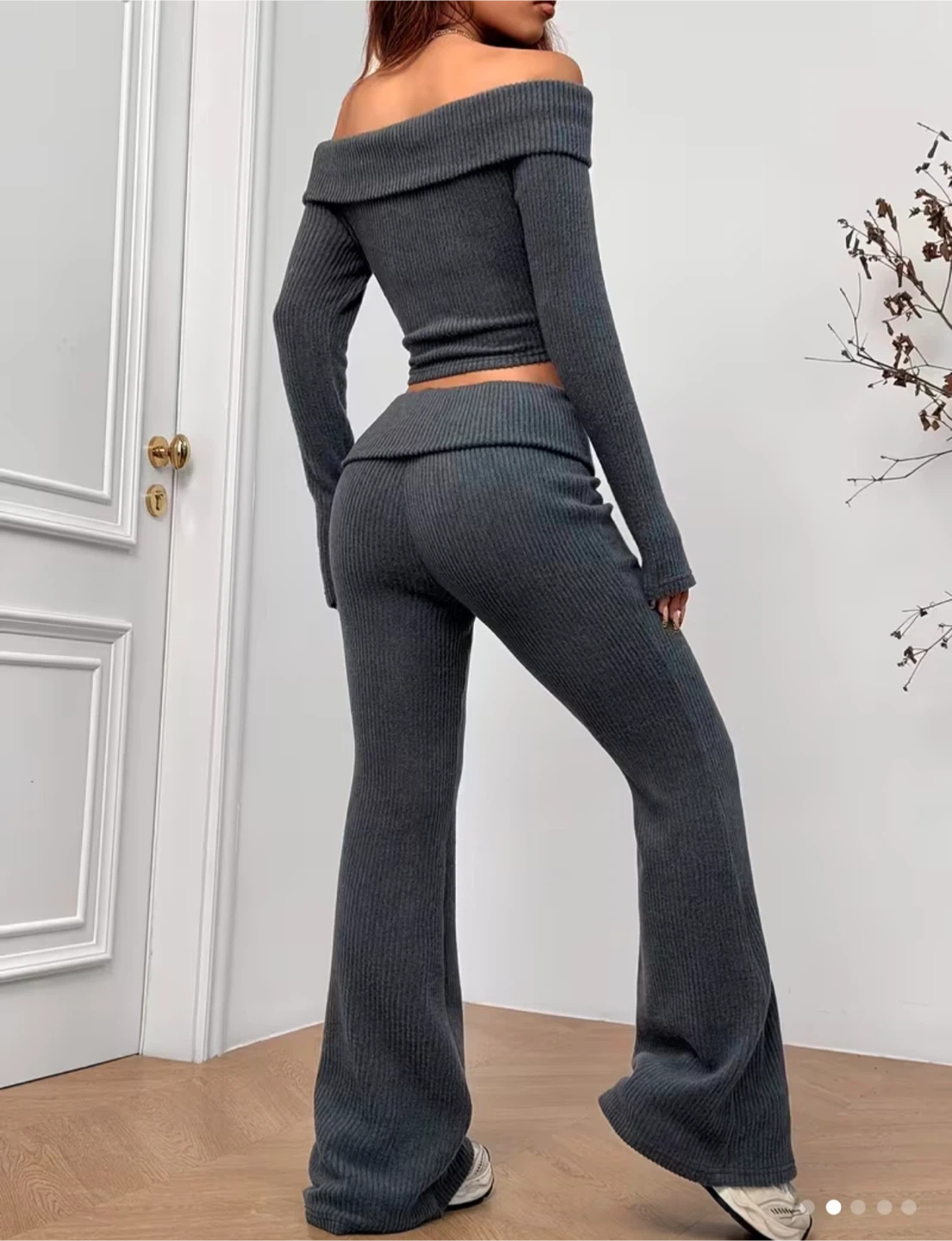 Grey Off-the-Shoulder Ribbed Crop Top & Flare Pants Set - Size S