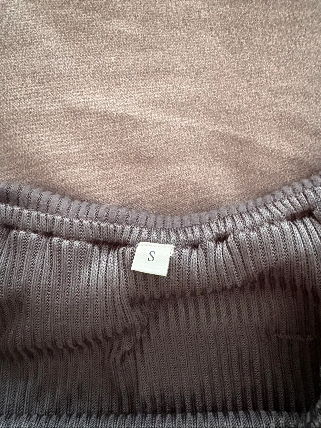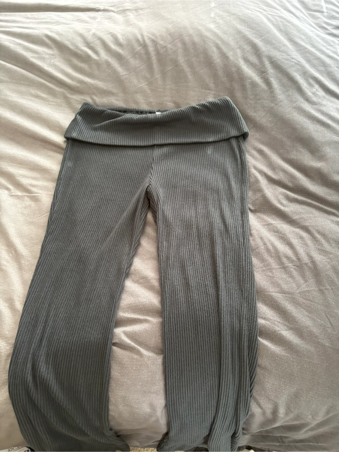 Ribbed knit set with an off-the-shoulder crop top and high-waisted flare pants. This outfit is a size small. It's made of a comfortable, stretchy material. Who would this be useful for? Someone looking for a stylish and casual matching set!