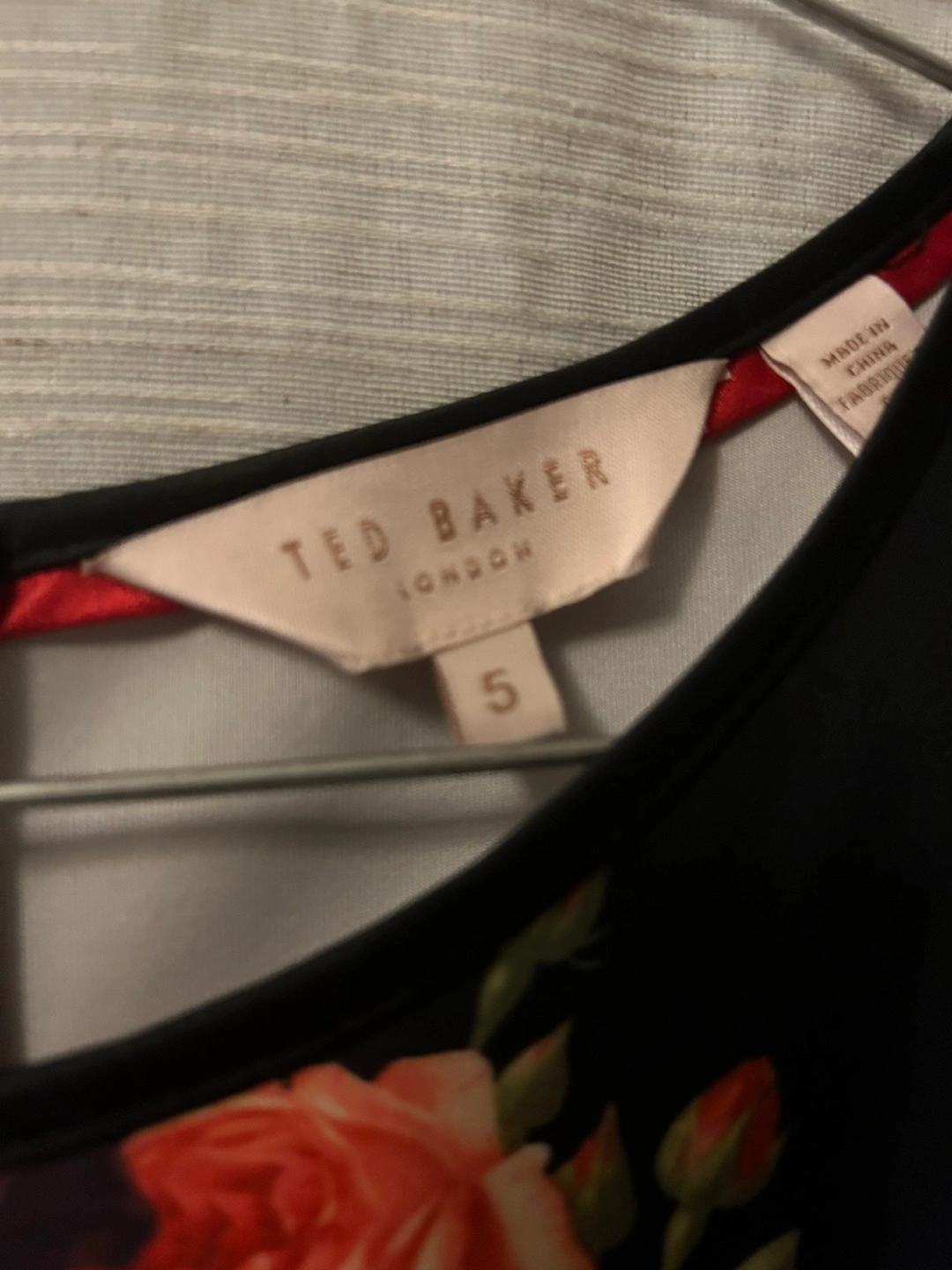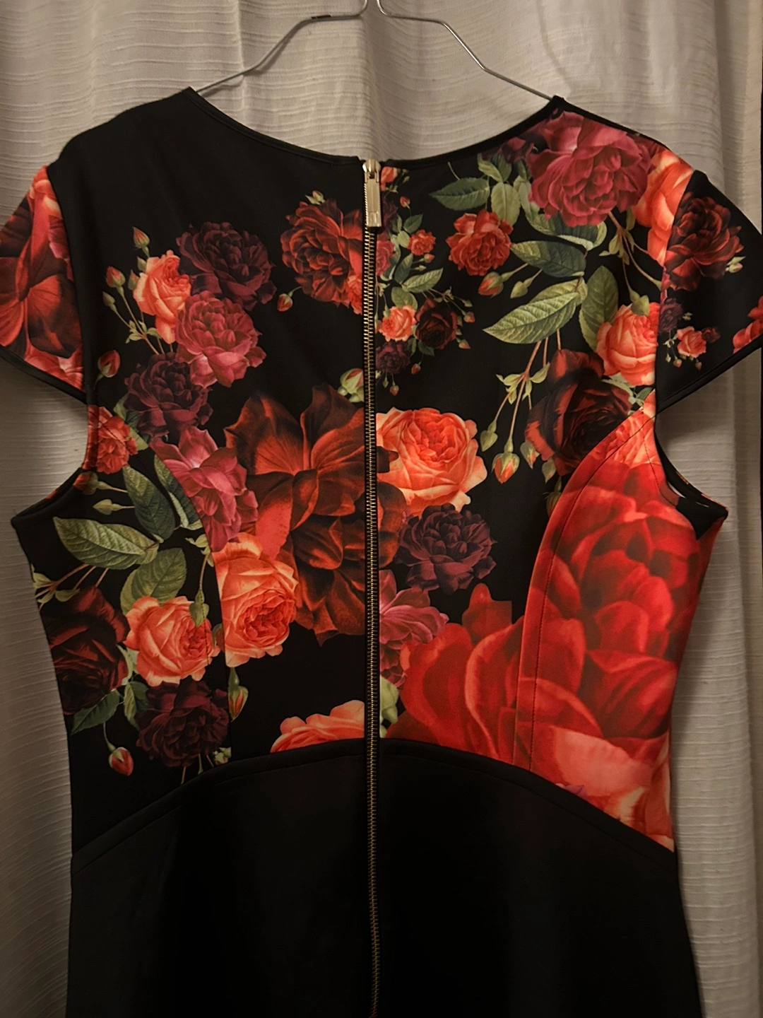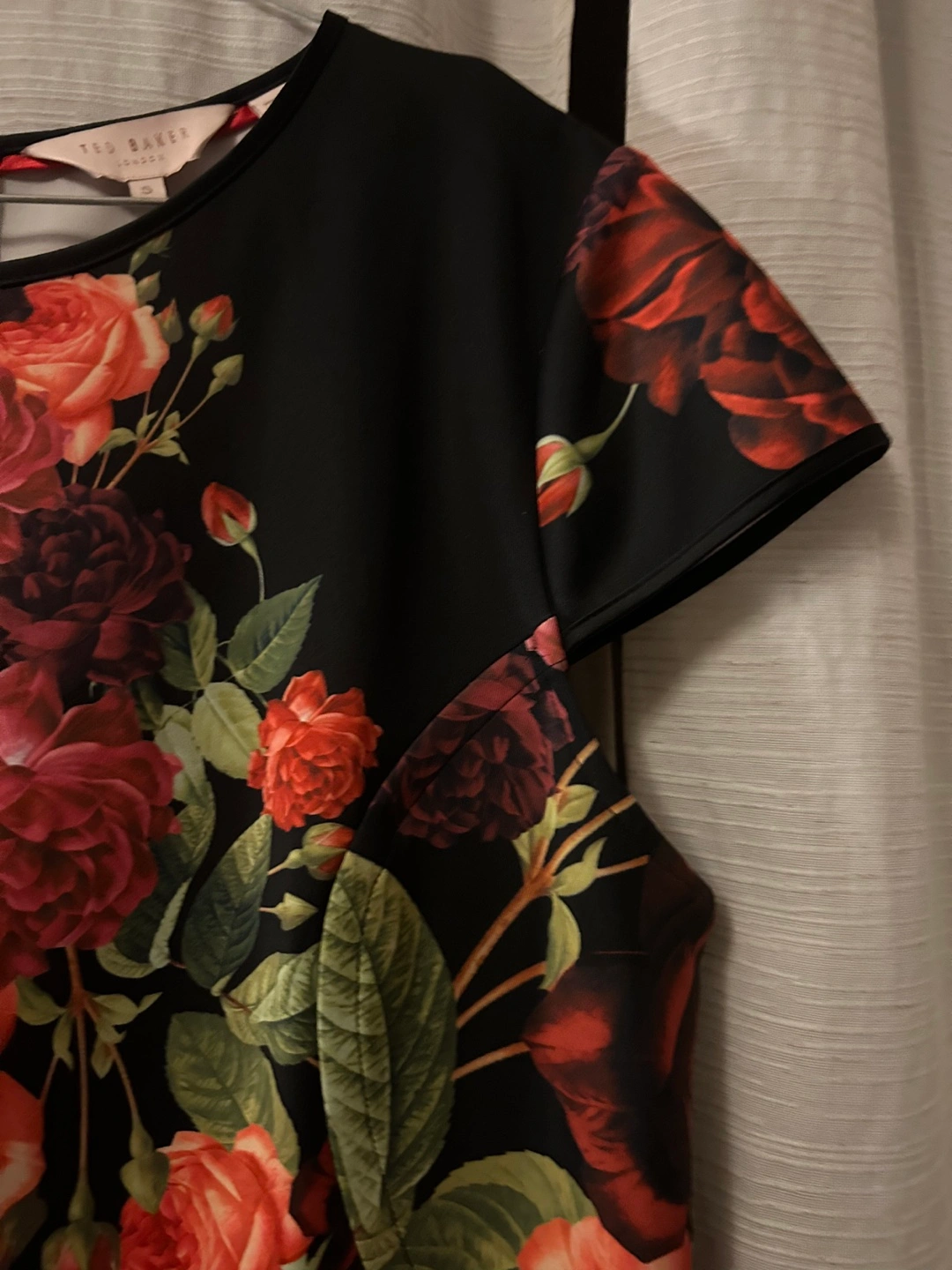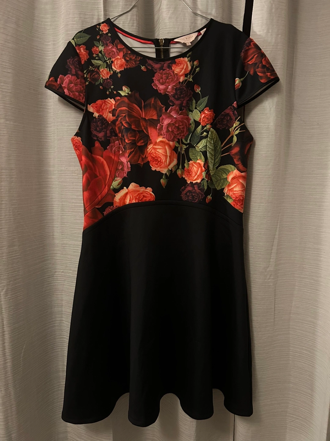 Beautiful Ted Baker London dress. Size 5. Floral print, black base. Short sleeves. Back zipper. A-line skirt.
