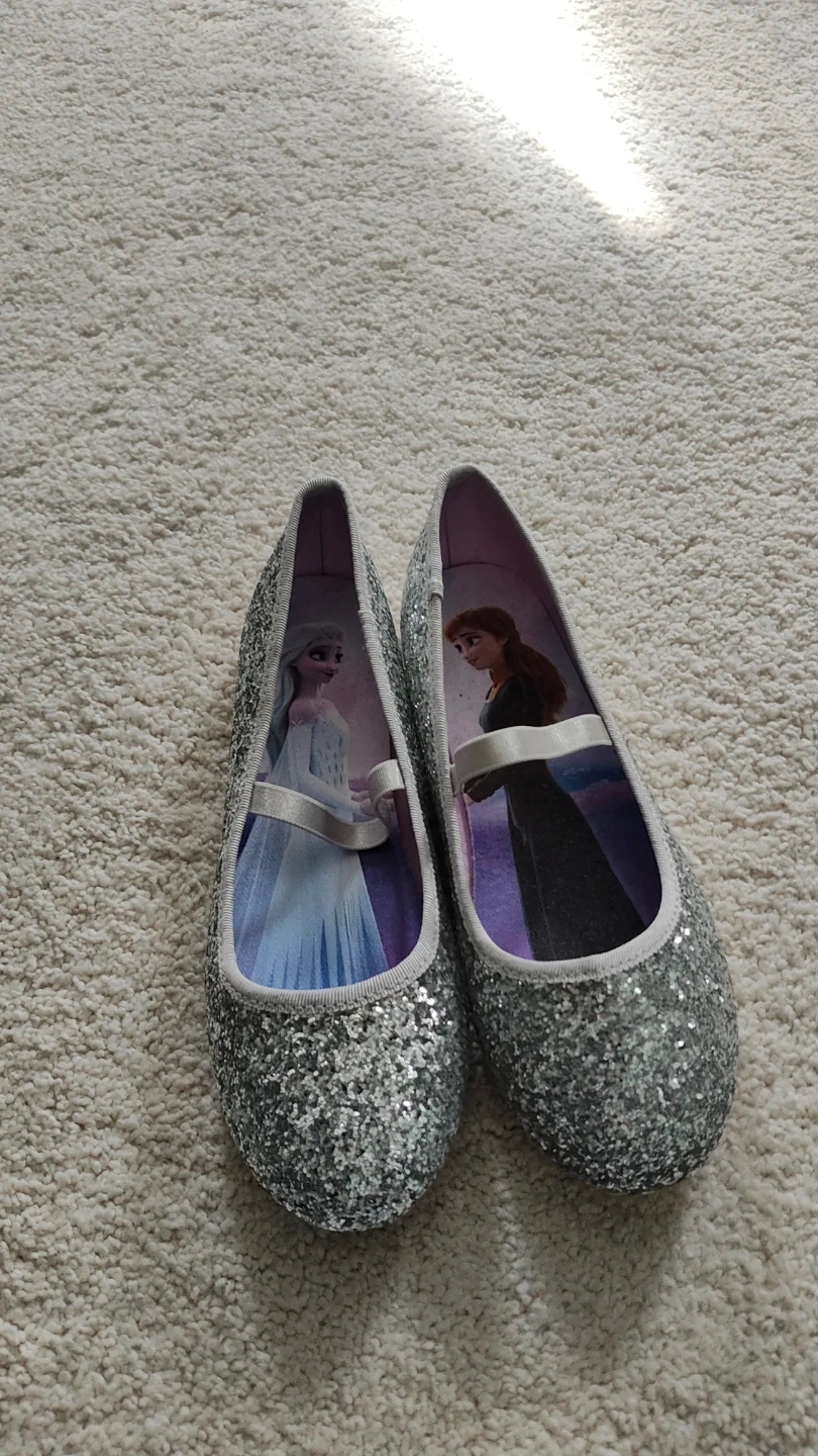Sparkly silver glitter ballet flats featuring Disney's Elsa and Anna. These shoes are a EUR size 34, which is a US size 2.5. They're perfect for any little Frozen fan!