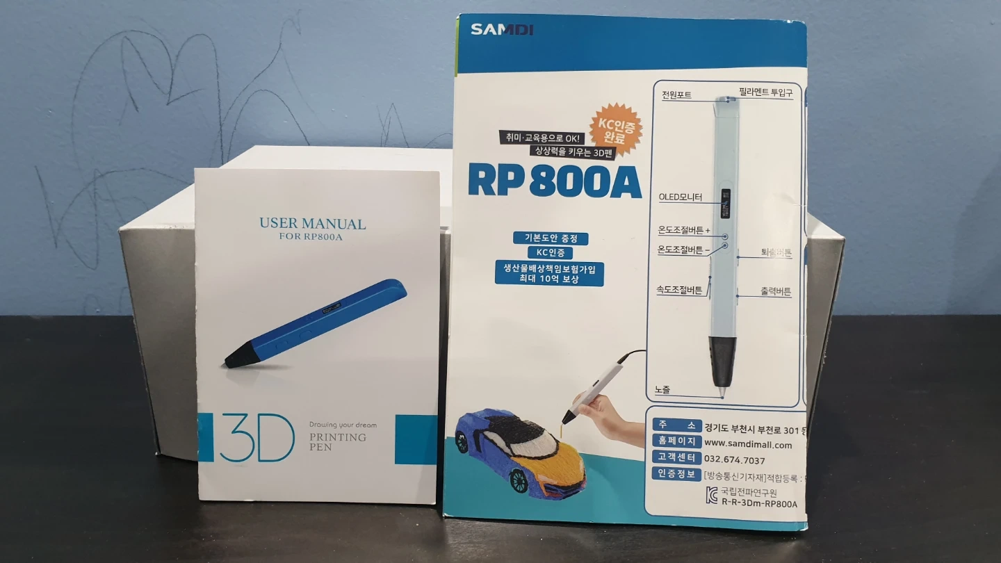 This 3D printing pen, model RP800A, comes with a user manual and PLA filaments in various colours. It's powered by USB and features an LED display for temperature settings. The bundle includes the pen, a USB cable, and new and used PLA filament. Good for education and hobby