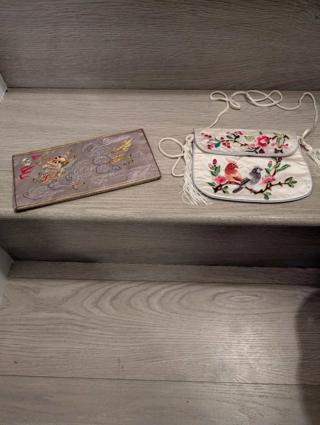 This set includes an embroidered clutch with a bird and floral design, and a matching coin purse featuring a dragon motif. Both are made of silk-like material with decorative tassels and embroidery. It's perfect for holding small essentials like coins, cards, or makeup.
