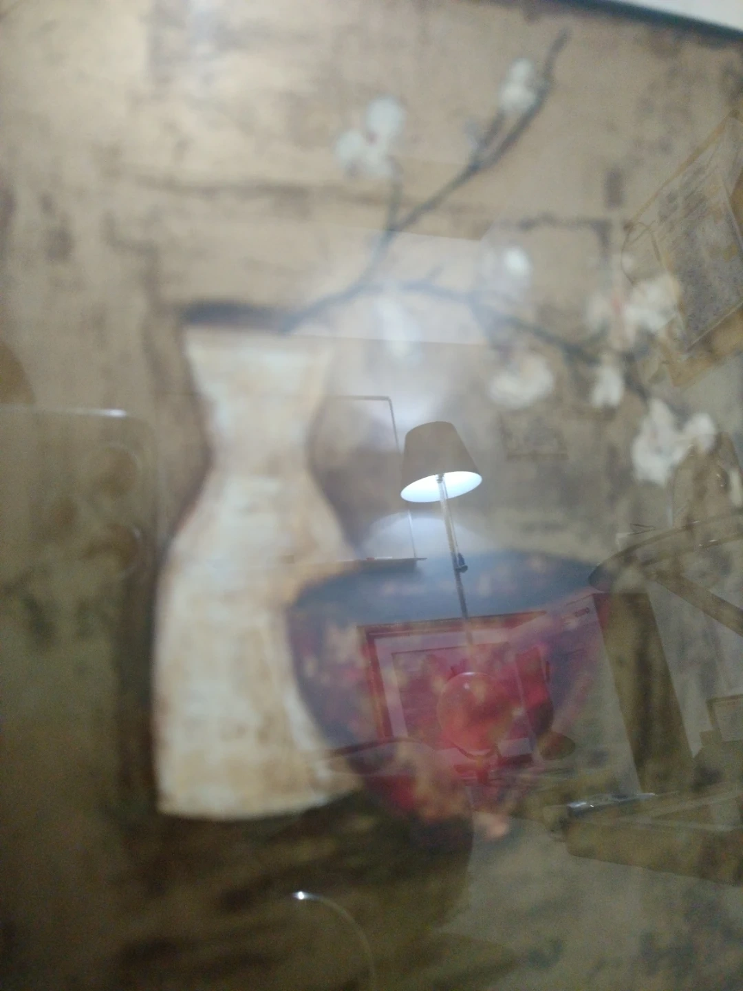 Framed art print featuring a still life of a white vase and a red bowl with a branch of white flowers. The print has a textured, crackled matte surrounding the artwork. It's ready to hang and would add a decorative touch to any room.