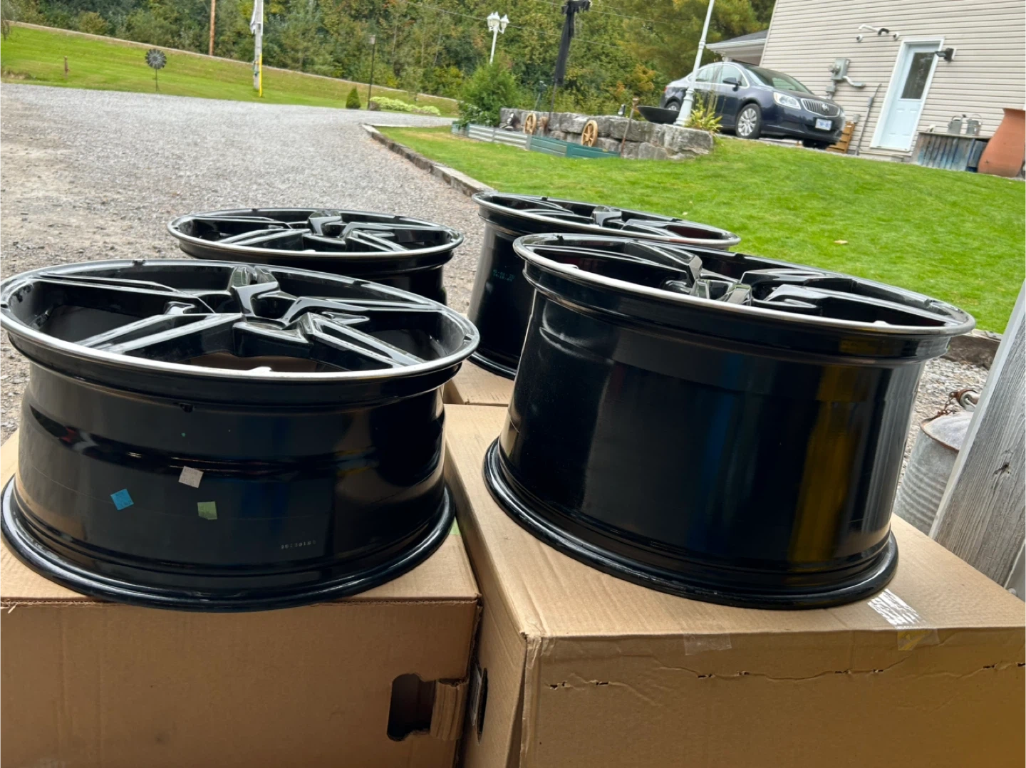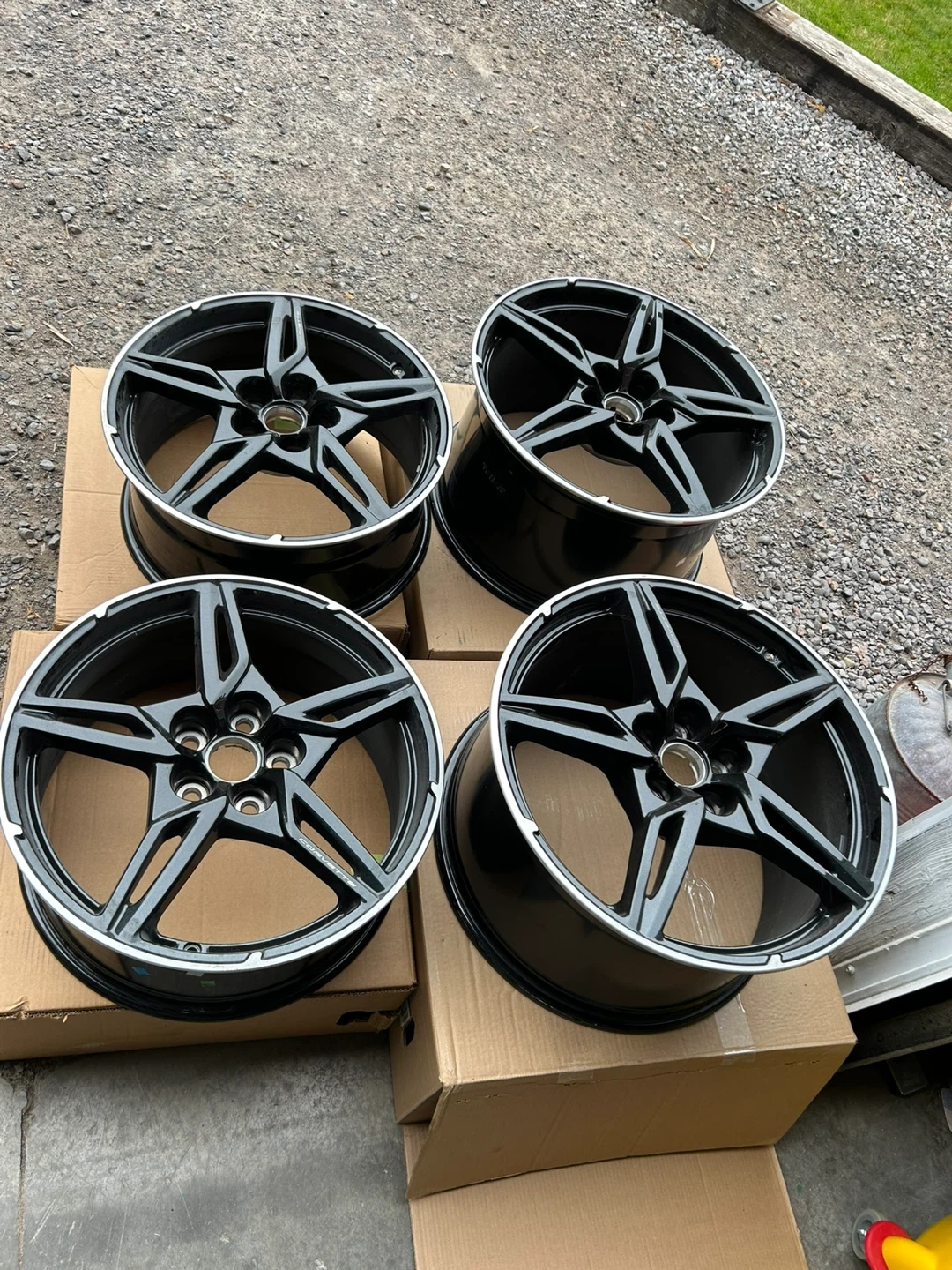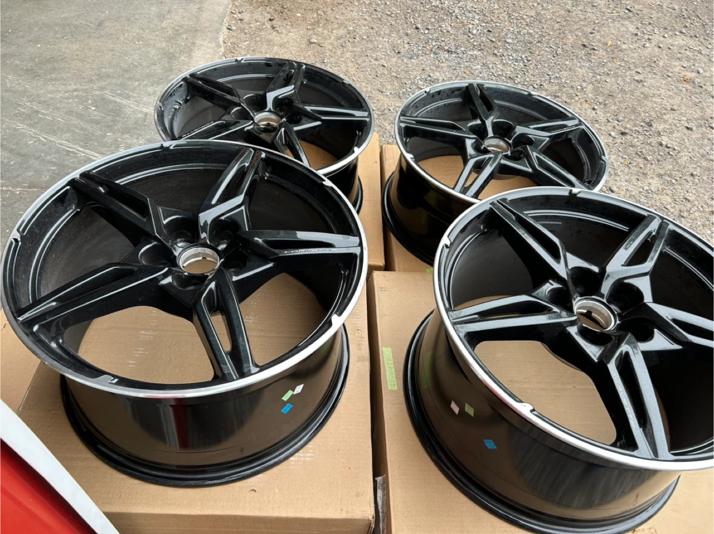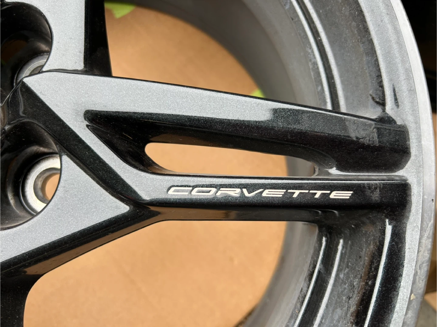 Set of four black Corvette wheels with a machined lip. The manufacturing date stamp appears to be February 1st, 2020. These are alloy wheels, designed for performance vehicles.