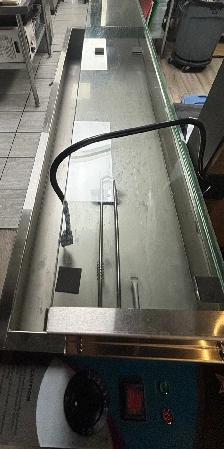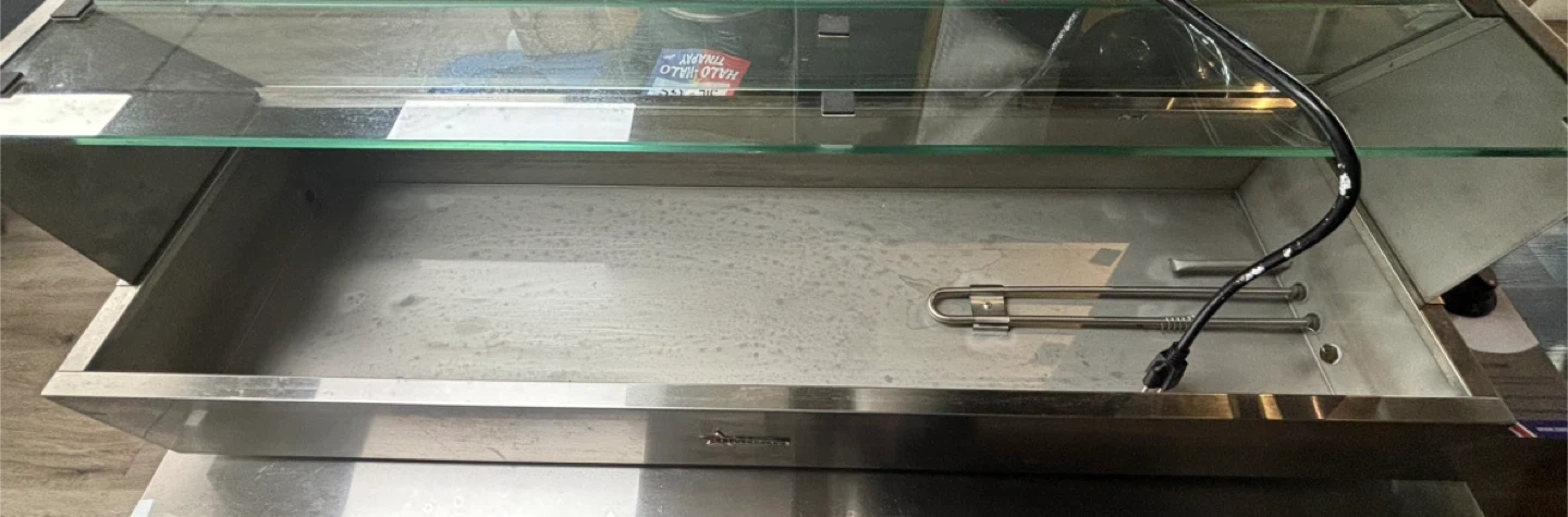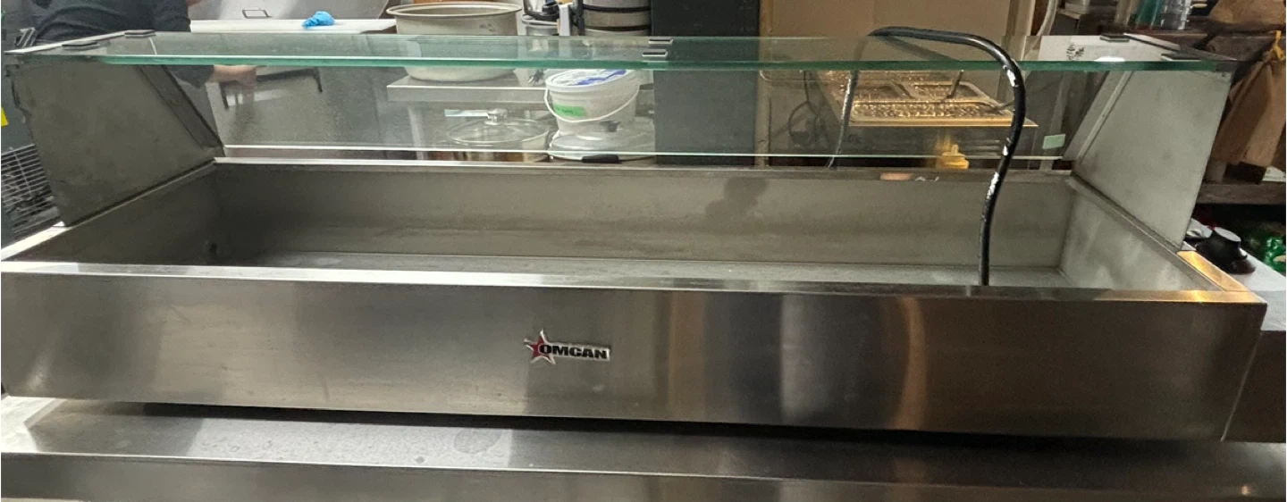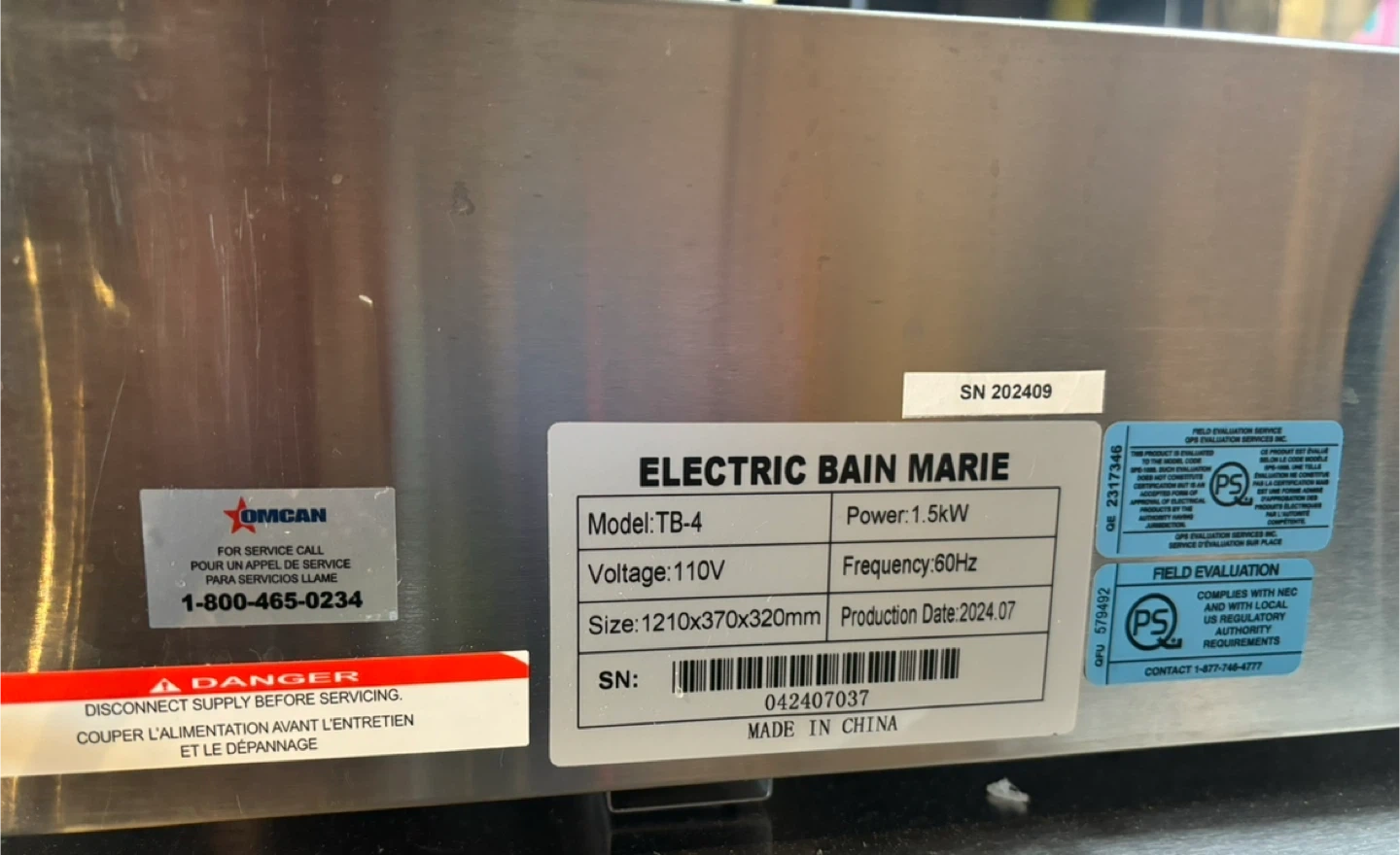 OMCAN electric bain marie, model TB-4. This unit has a voltage of 110V and a power of 1.5kW. Its size is 1210x370x320mm. Production date is 2024 07. Perfect for keeping food warm in a commercial setting!