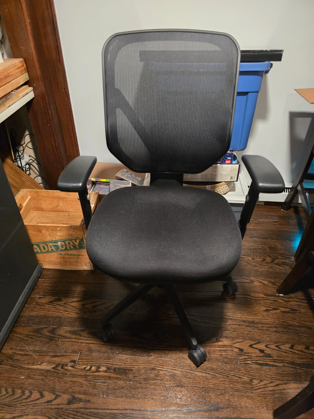 Black office chair. Mesh back and fabric seat. Adjustable height and armrests. Five rolling casters. Good for home or office use.