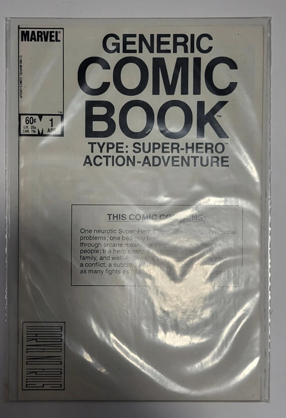 This is Marvel's Generic Comic Book #1. It's a super-hero action-adventure type comic. Includes one neurotic Super-Hero with personal problems, a bad-guy bent on world domination, and the hero's net worth is as high as his family and well-endowed with a conflict. It contains as many fights as it takes! NM condition.