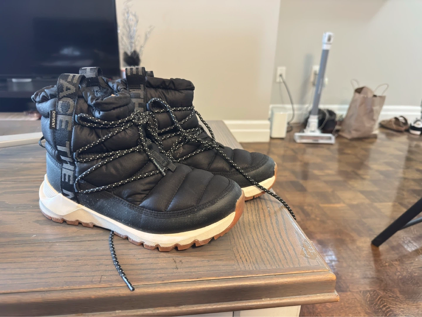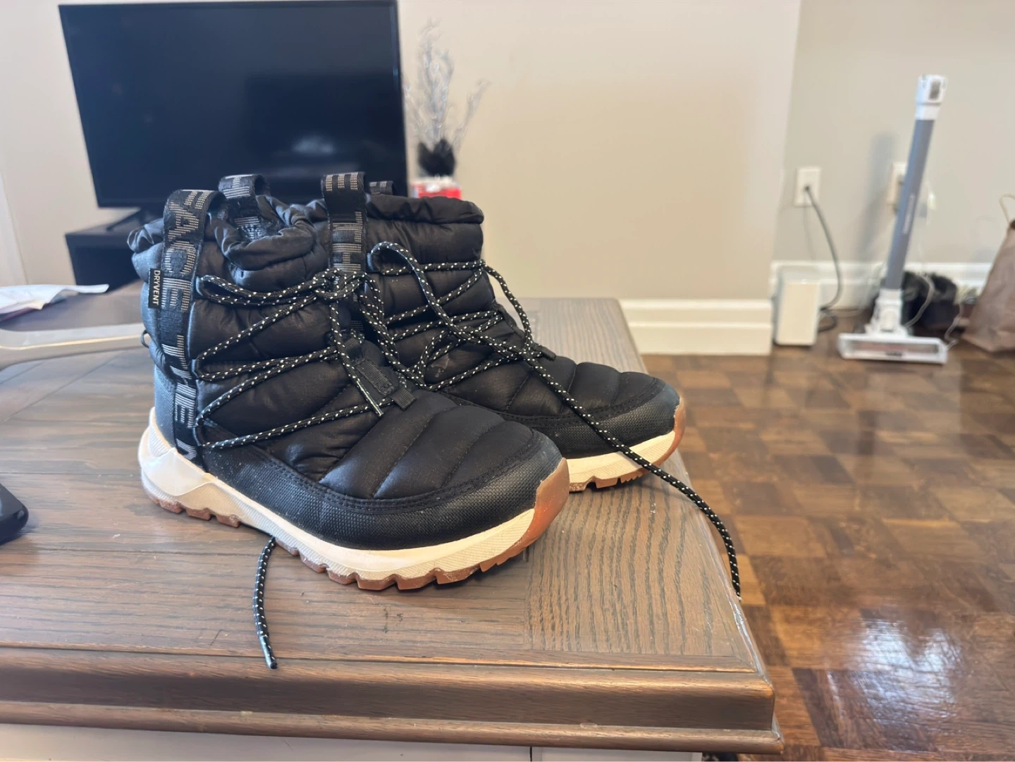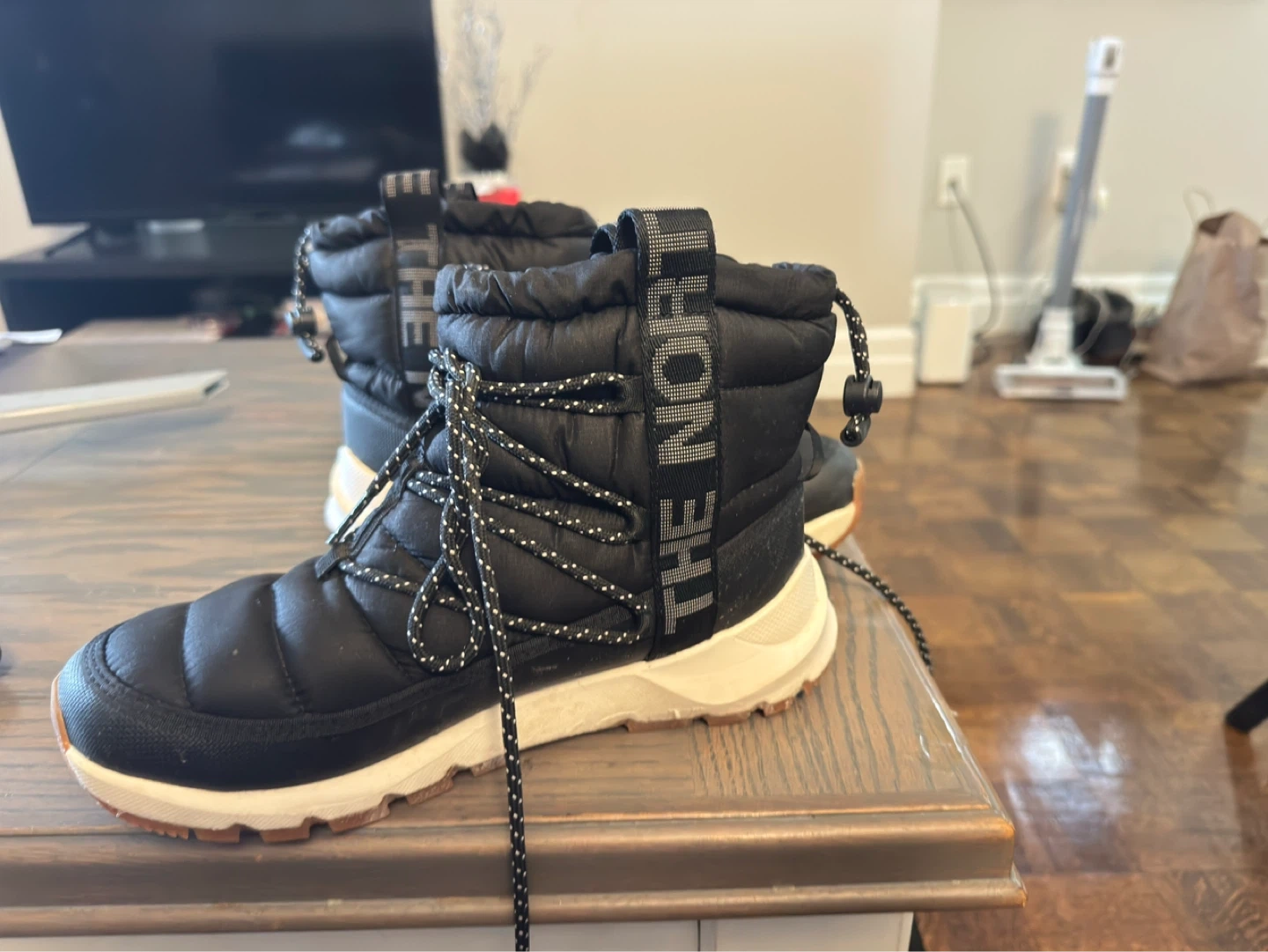 These are The North Face winter boots in black. They're insulated and have a waterproof exterior. Perfect for keeping your feet warm and dry in cold weather!