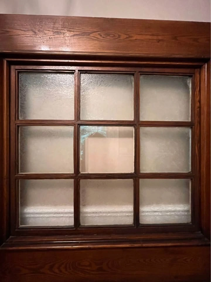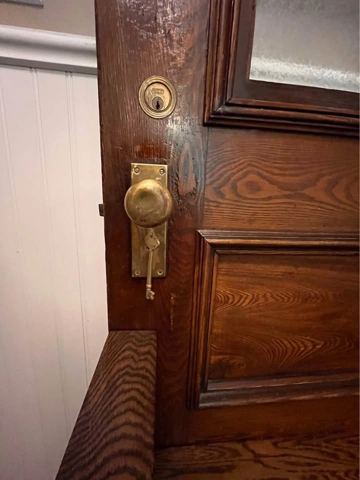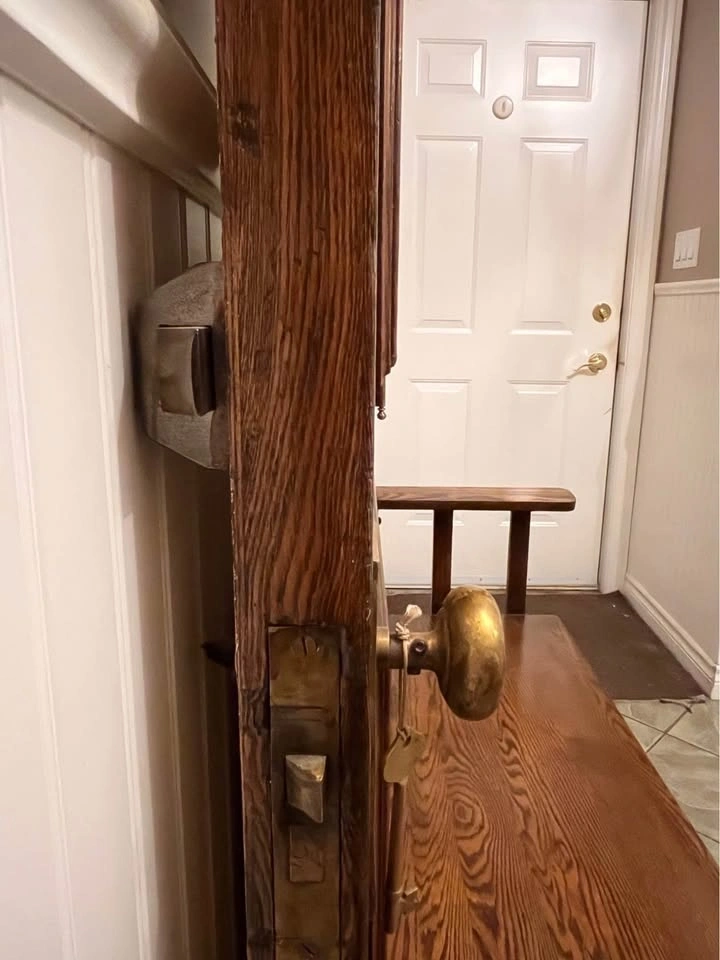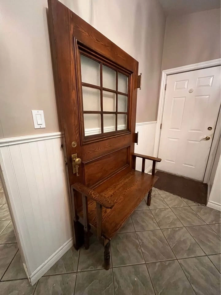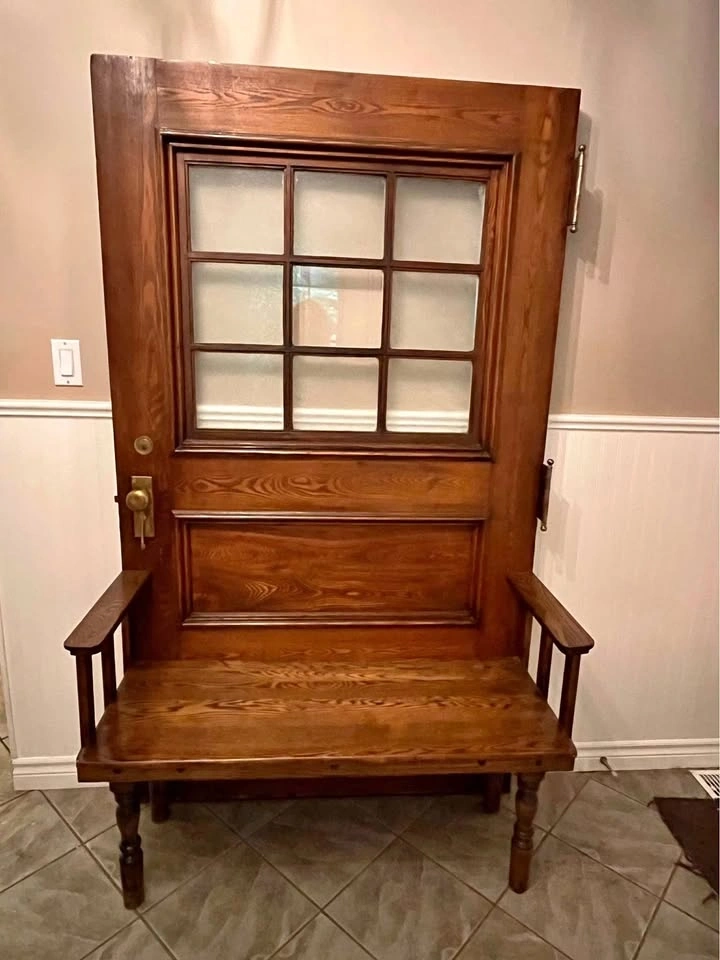 Beautiful vintage antique original Brantford Collegiate Institute classroom door from 1910, with original hardware and lock key, set into a custom-built oak entry bench. $500 or best reasonable offer.
