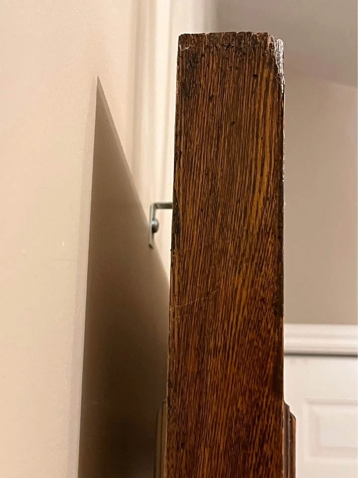 This is a heavy piece, so securing it to the wall is recommended (hardware included). The back of the door is unfinished and retains its original classroom paint. The bench can be removed from the door if needed for transport. Additional measurements can be provided upon request.