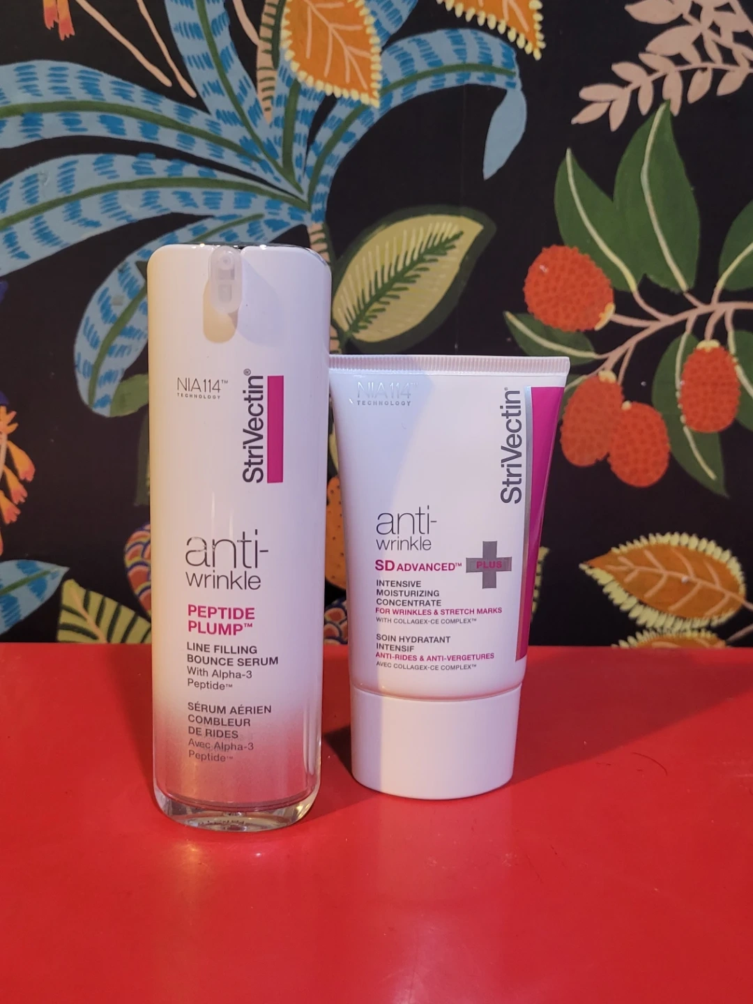 This Strivectin set includes their Anti-Wrinkle Peptide Plump Line Filling Bounce Serum and an Intensive Moisturizing Concentrate for Wrinkles & Stretch Marks. The serum is 30 ml/1 fl oz, and the moisturizer is 47 ml/1.6 fl oz. It's designed to target fine lines and wrinkles.
