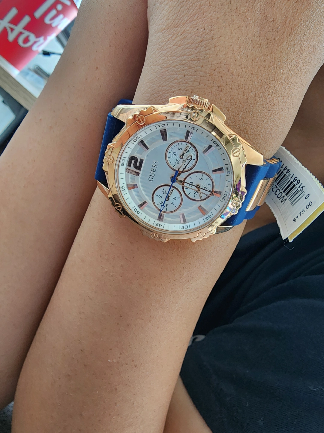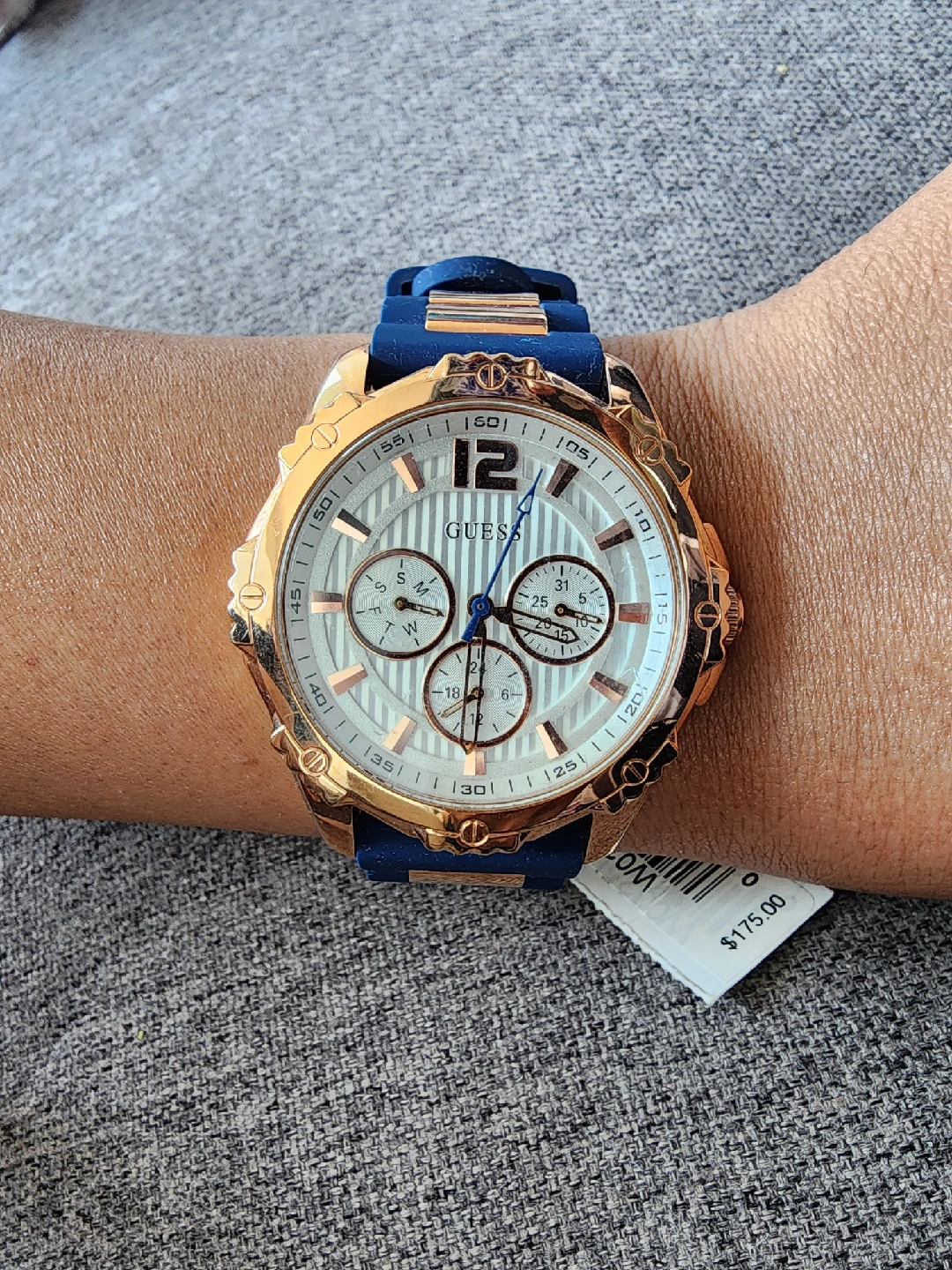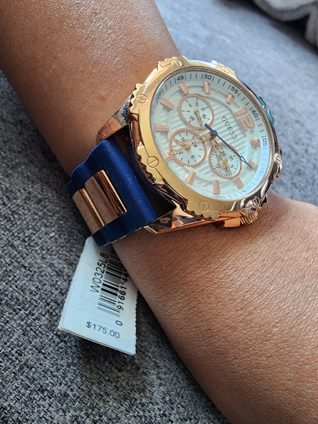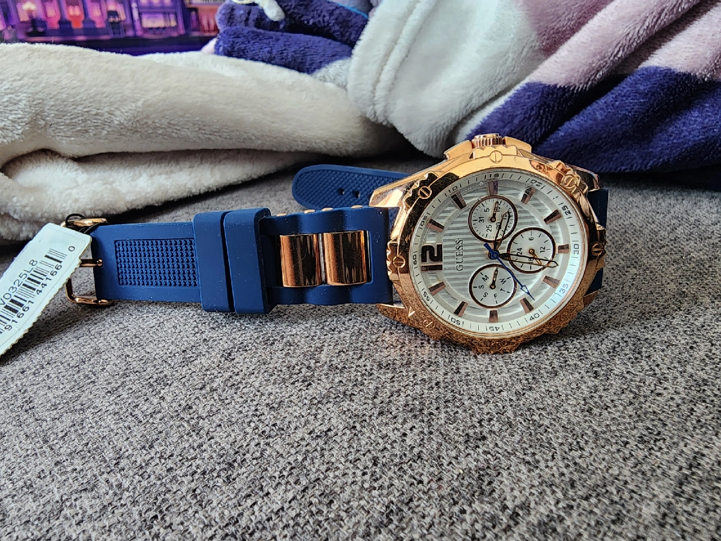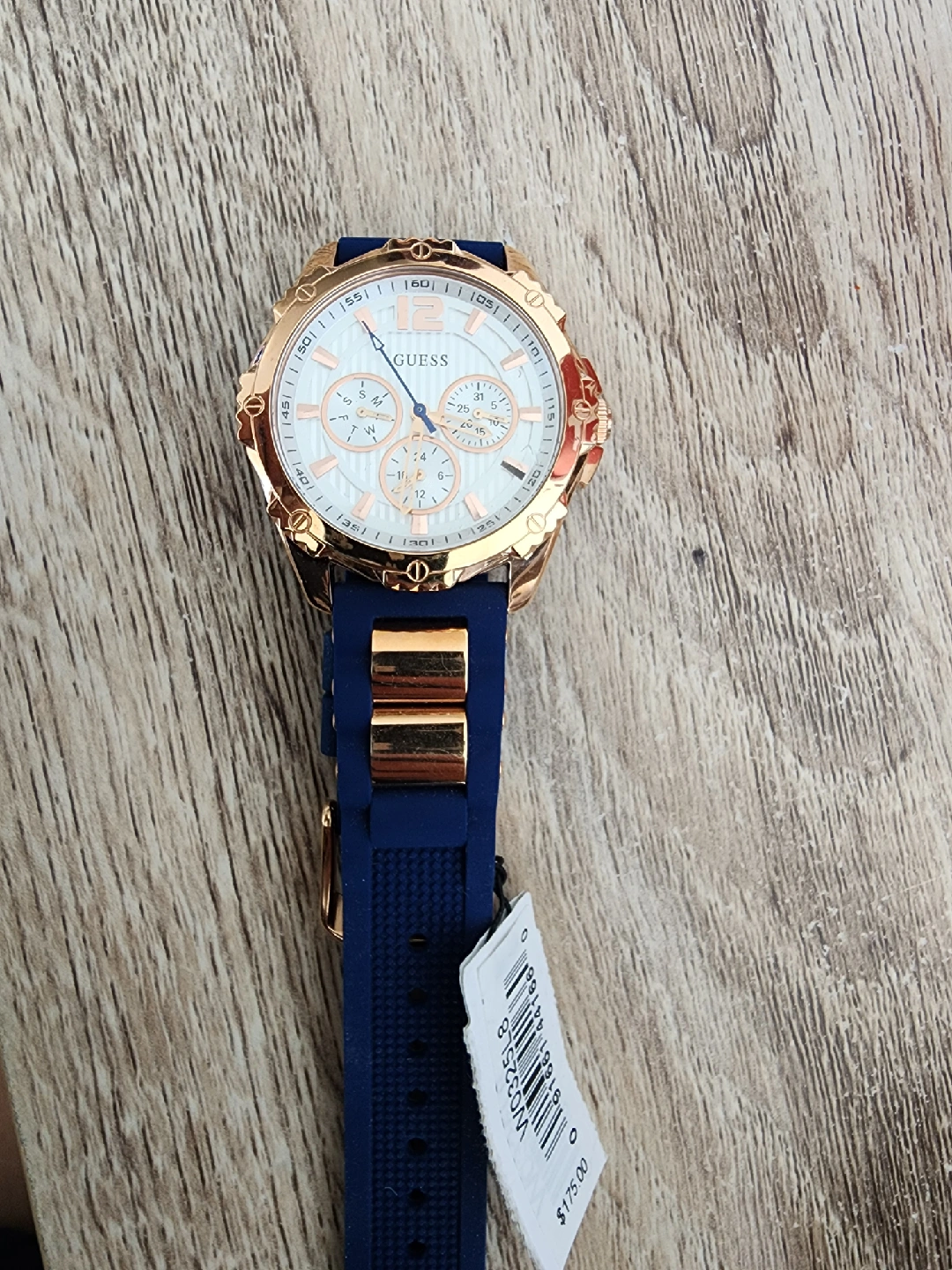 New unisex Guess watch with a beautiful gold and blue design! The watch features a chronograph dial and a comfortable blue silicone strap.
