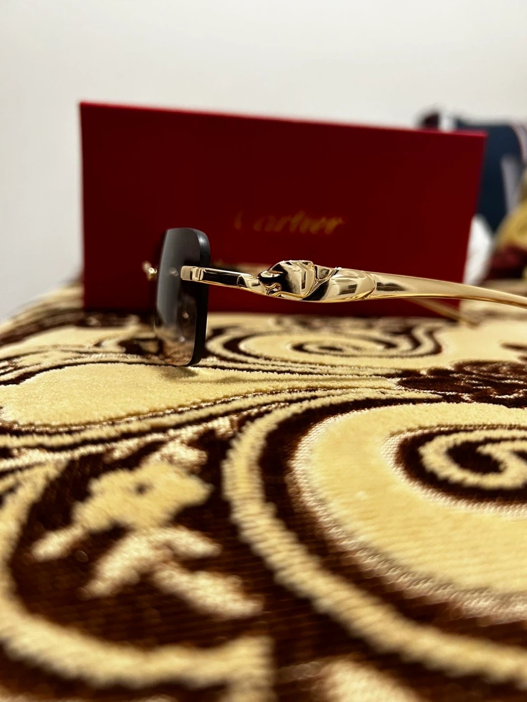 Cartier rimless sunglasses in gold with a panther detail on the temple. Gradient lenses included. Comes with the original red Cartier box.