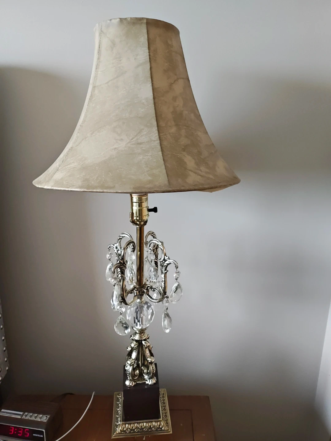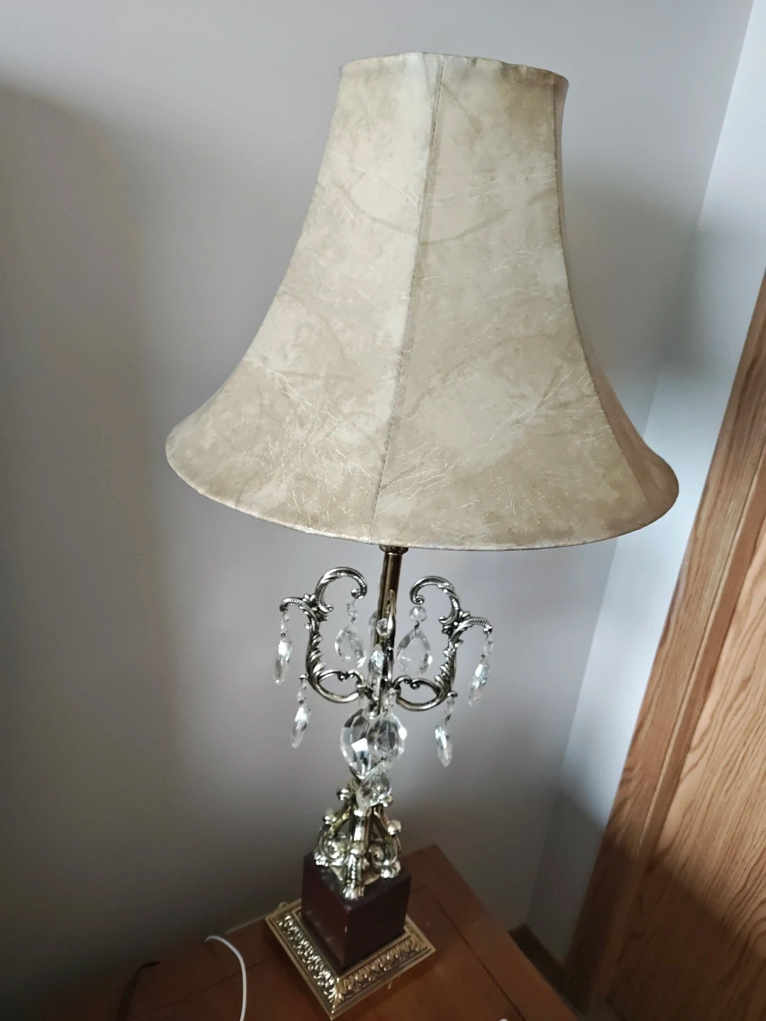 This elegant table lamp features a classic beige lampshade and a decorative crystal accent on its ornate metal base. It's a stylish addition to any room, providing warm ambient lighting. The lamp has a standard bulb socket and a sturdy, decorative base.