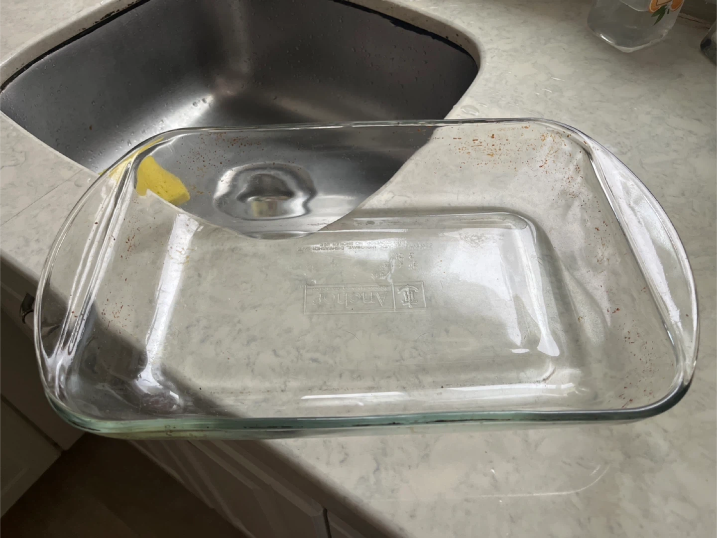 Anchor Hocking glass baking dish. It's clear and made of durable glass. This dish is oven safe and perfect for baking casseroles or roasts.