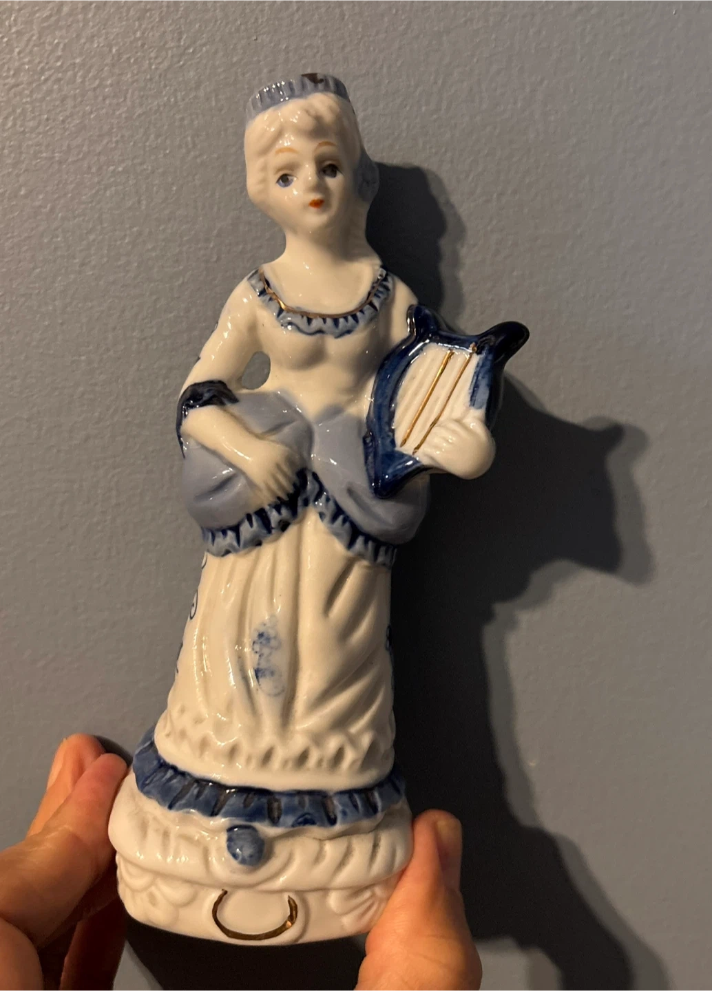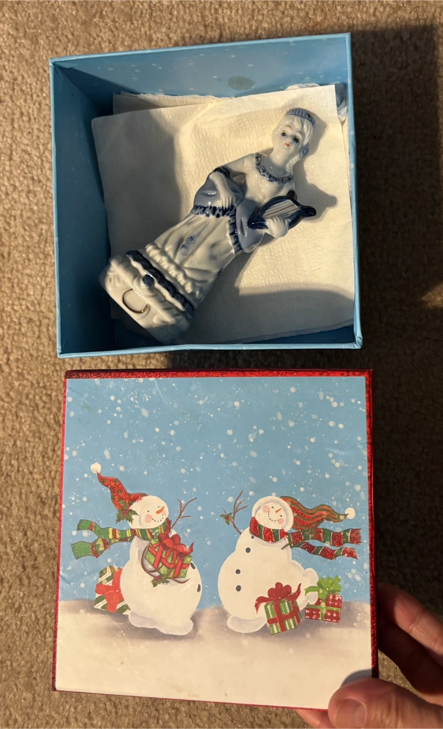 This is a ceramic figurine of a woman holding a lyre (about 6”). It's painted with blue and white detailing. The figurine comes in a decorative box with a snowman design.