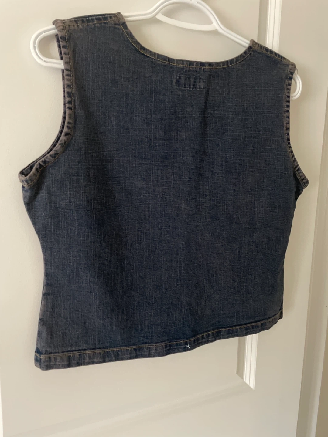 This is a Bongo denim vest. It's made of 96% cotton and 4% spandex. The vest has a button-up front. It's a great layering piece for your wardrobe!