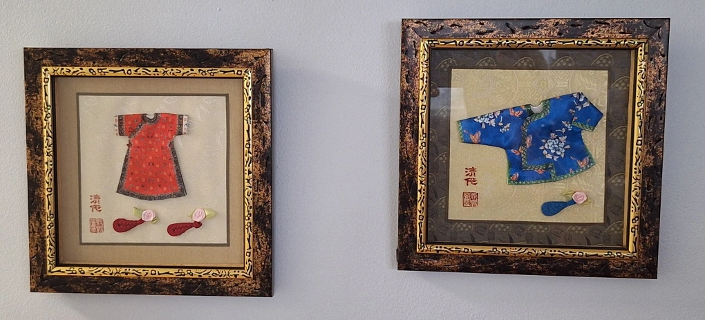 Set of two framed miniature clothing art pieces. One is a red dress and the other is a blue top. Both are in excellent condition and ready to add a unique touch to your home decor. $7 each, $10 for two.