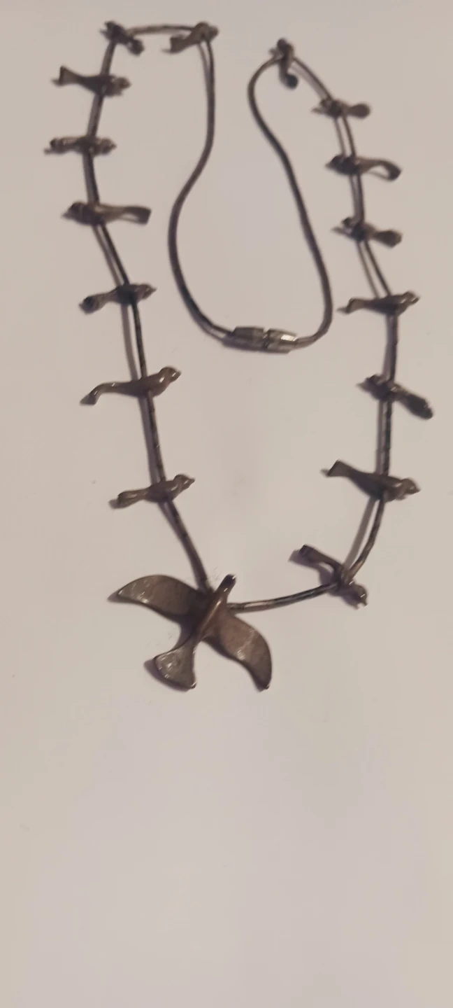 A unique old vintage sterling silver necklace featuring a central dove charm with smaller bird charms adorning the chain. It closes with a secure clasp. This piece adds a touch of nature-inspired elegance to any outfit! 20" long. Good condition. ALL MY PRICES ARE NEGOTIABLE !!