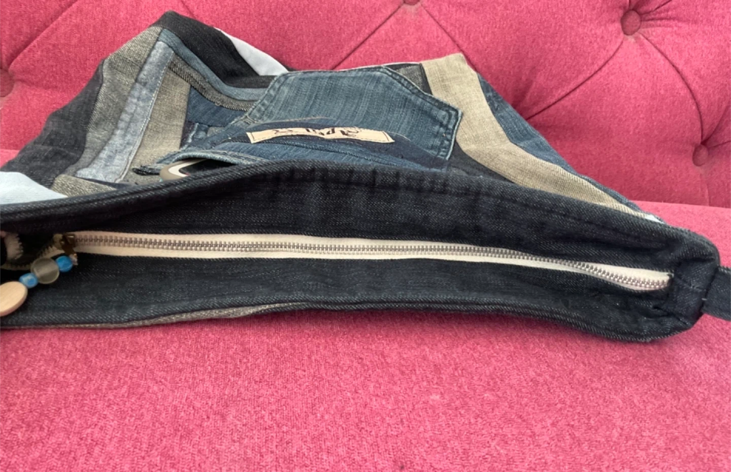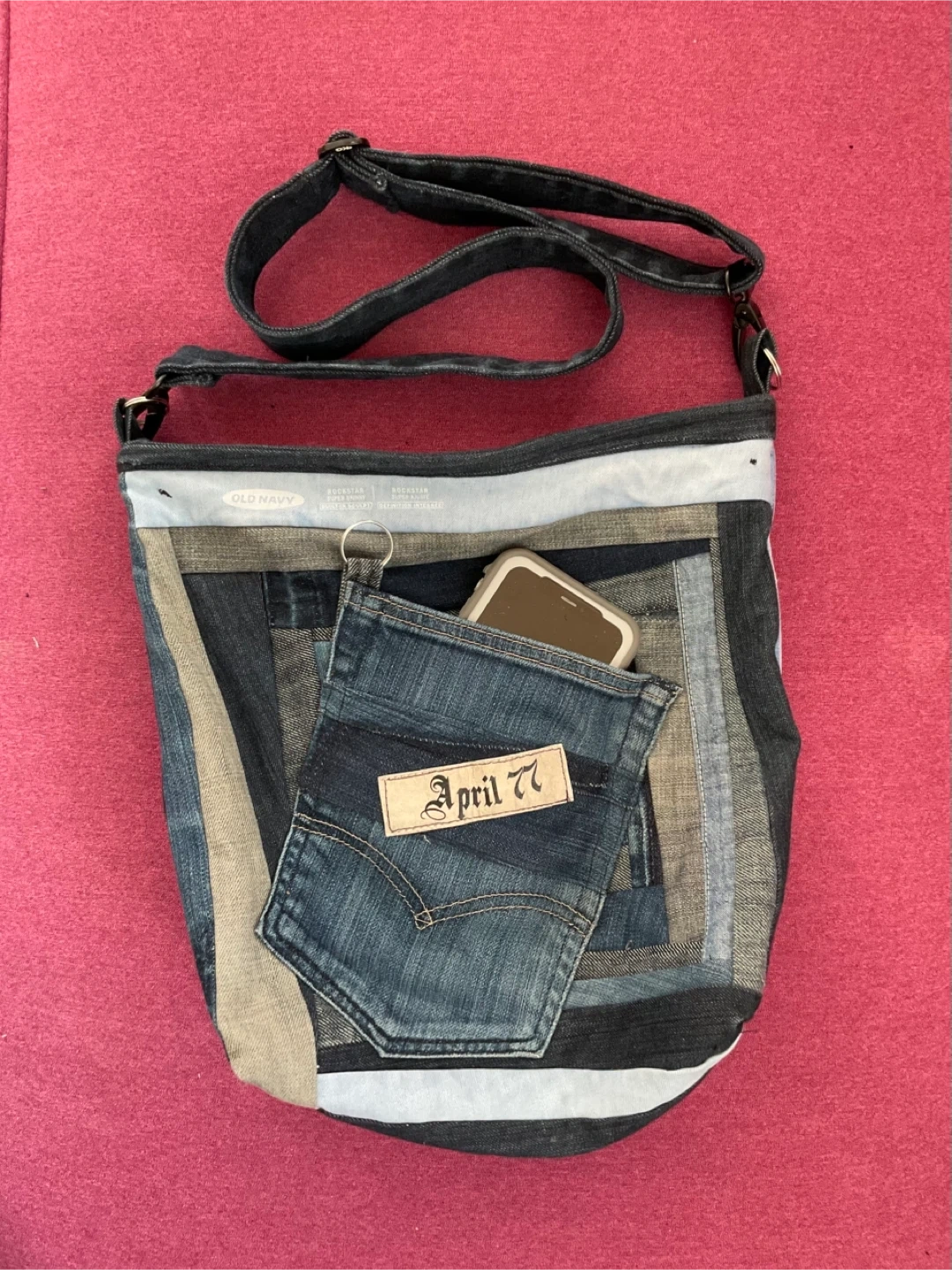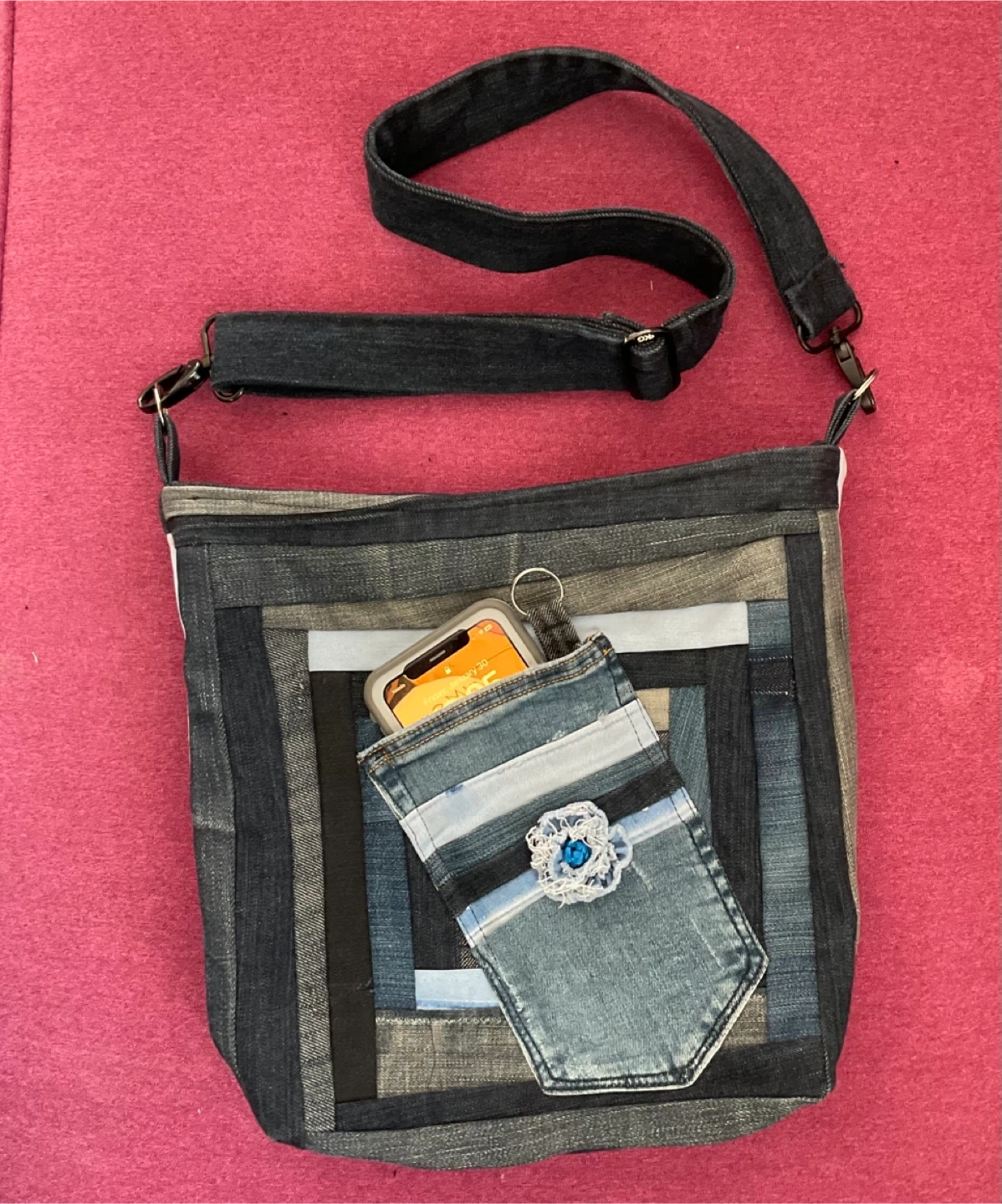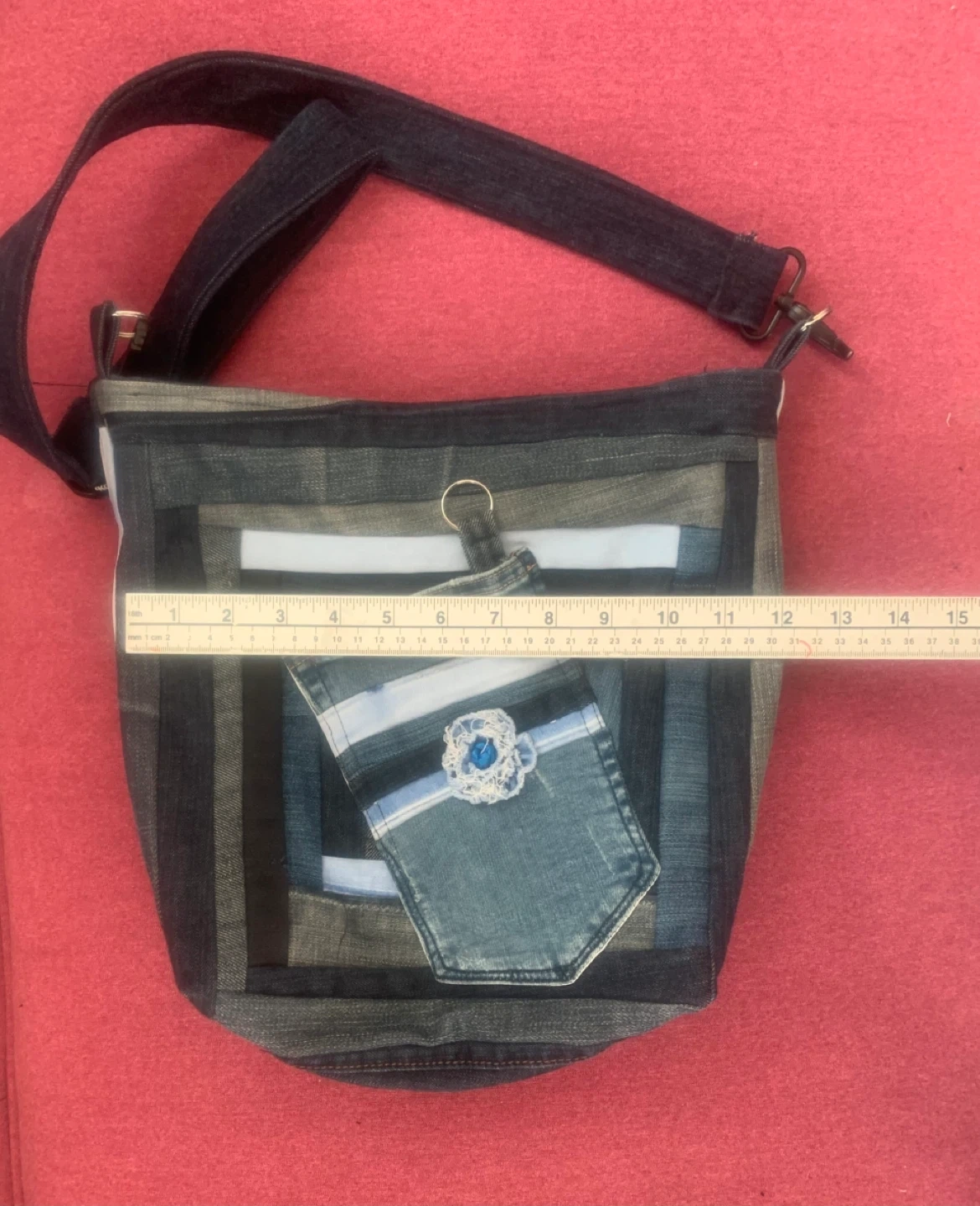This unique one of a kind shoulder bag is crafted from various denim washes. It features a front pocket with a decorative blue flower accent and is big enough to accommodate your phone.