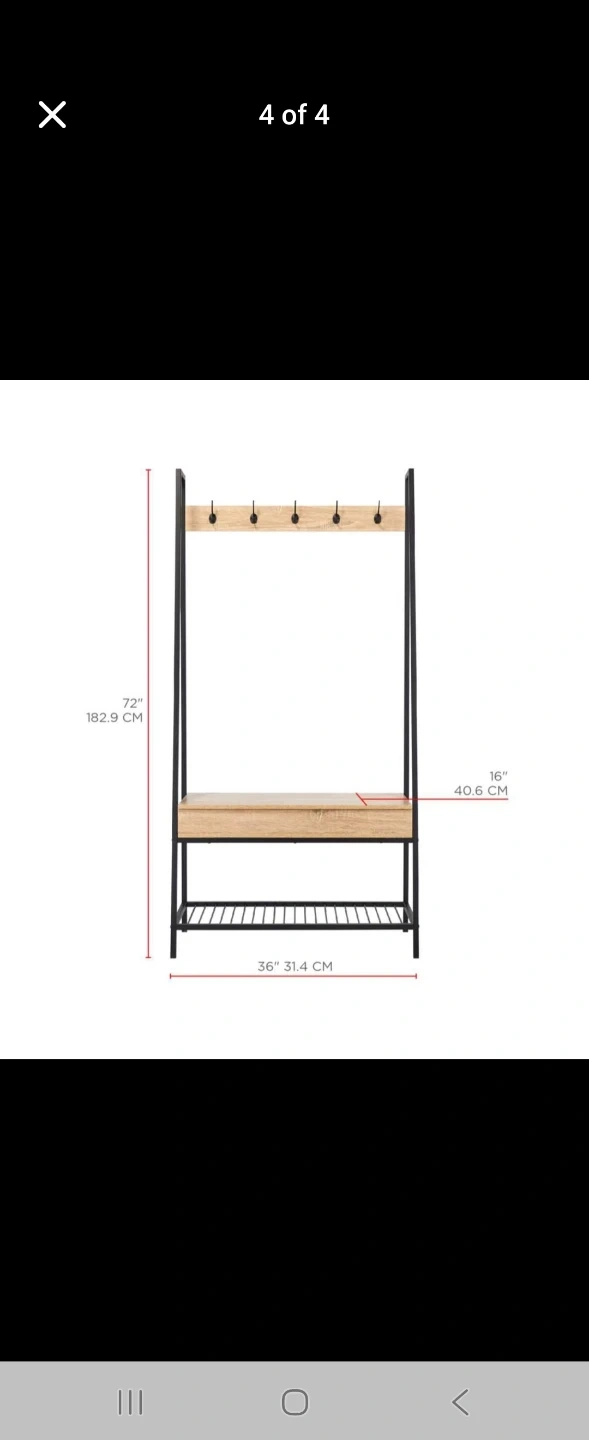 This hall tree features a sturdy metal frame with a wood-look finish. It includes multiple coat hooks, a bench with a lift-top storage compartment, and a bottom shelf for shoes. The dimensions are 72" H x 36" W x 16" D. It's perfect for organizing entryways!