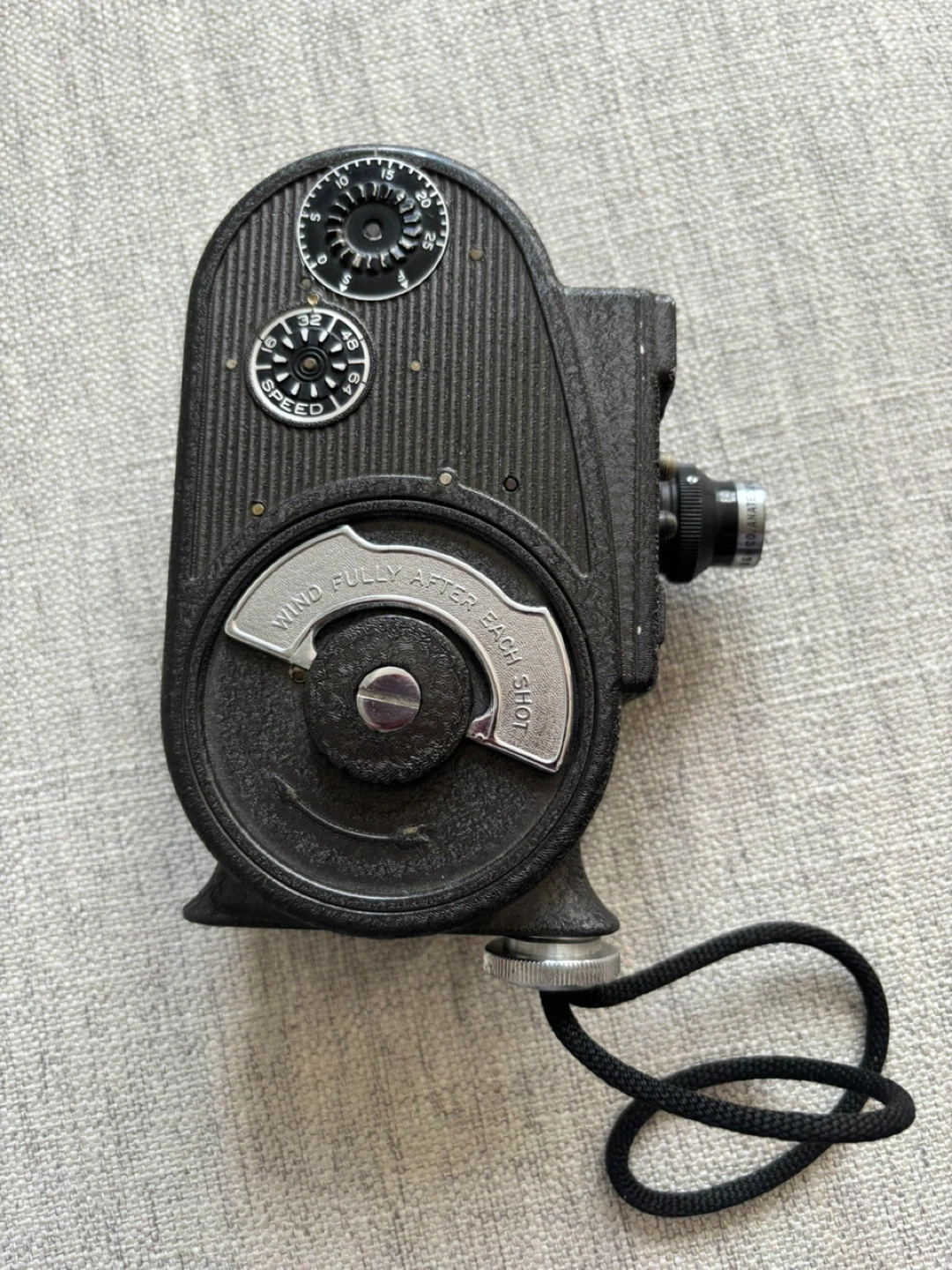 1940’s vintage Bell & Howell Filmo Sportster 8mm movie camera. This camera has adjustable speed settings and includes a winding crank. Spring motor winds and runs.