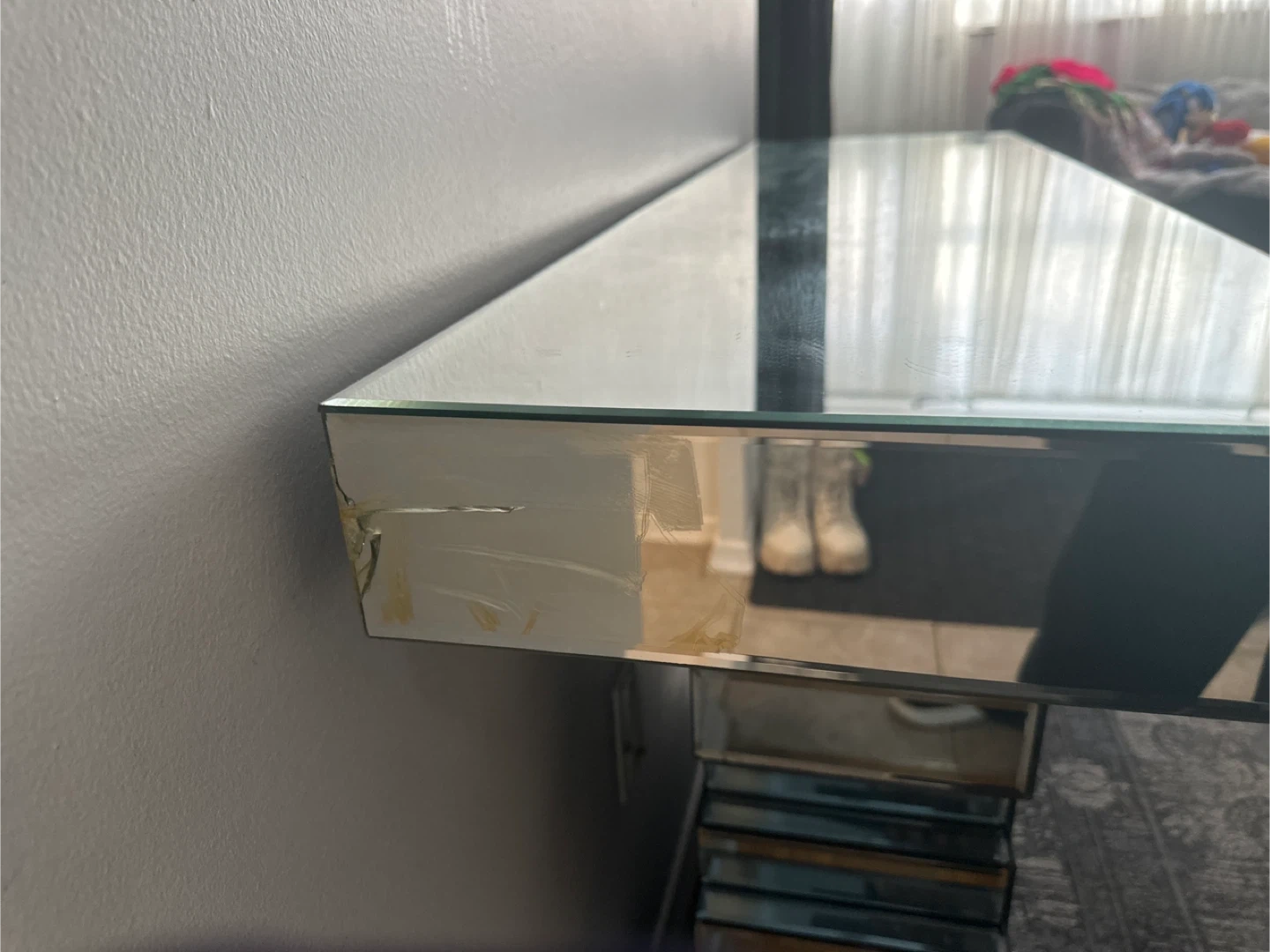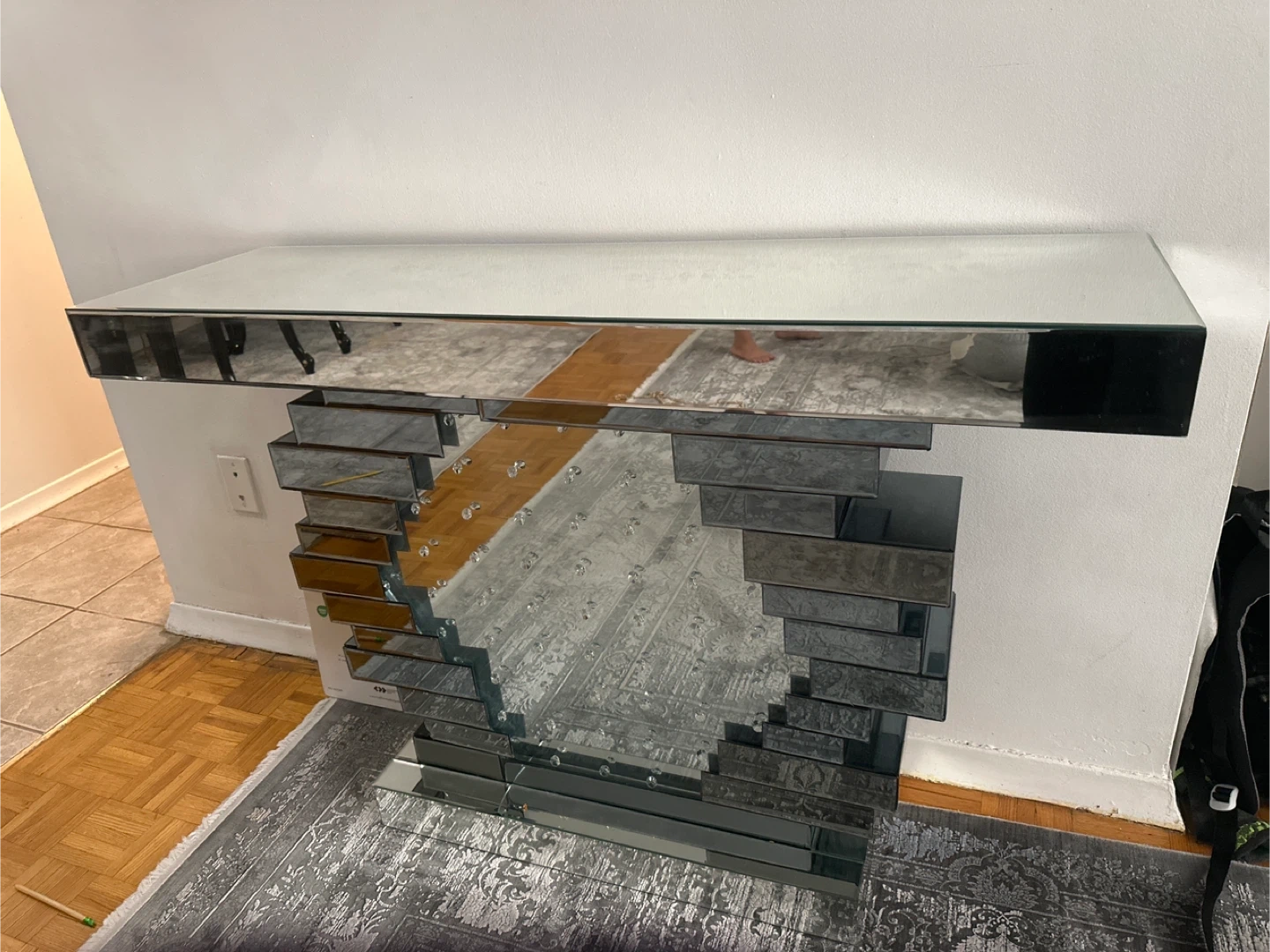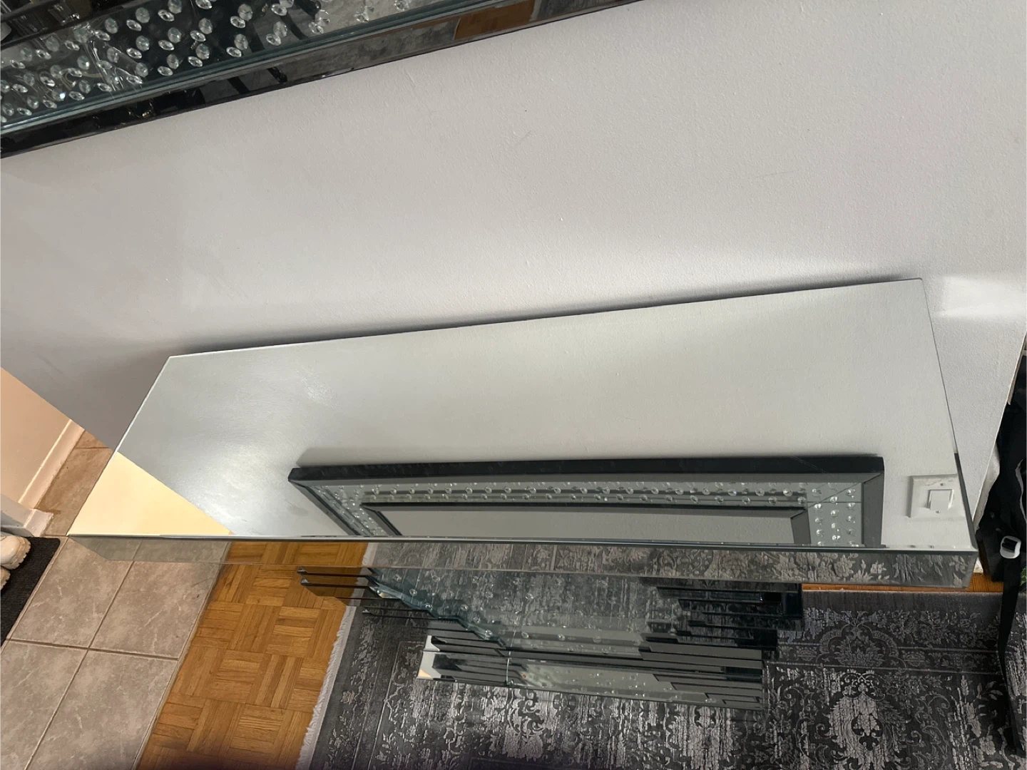 A stylish rectangular wall mirror featuring a dark grey frame embellished with clear crystal accents. This decorative piece will add a touch of glamour to any room. Its reflective surface makes spaces feel larger and brighter.
