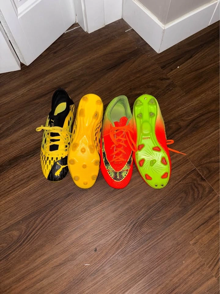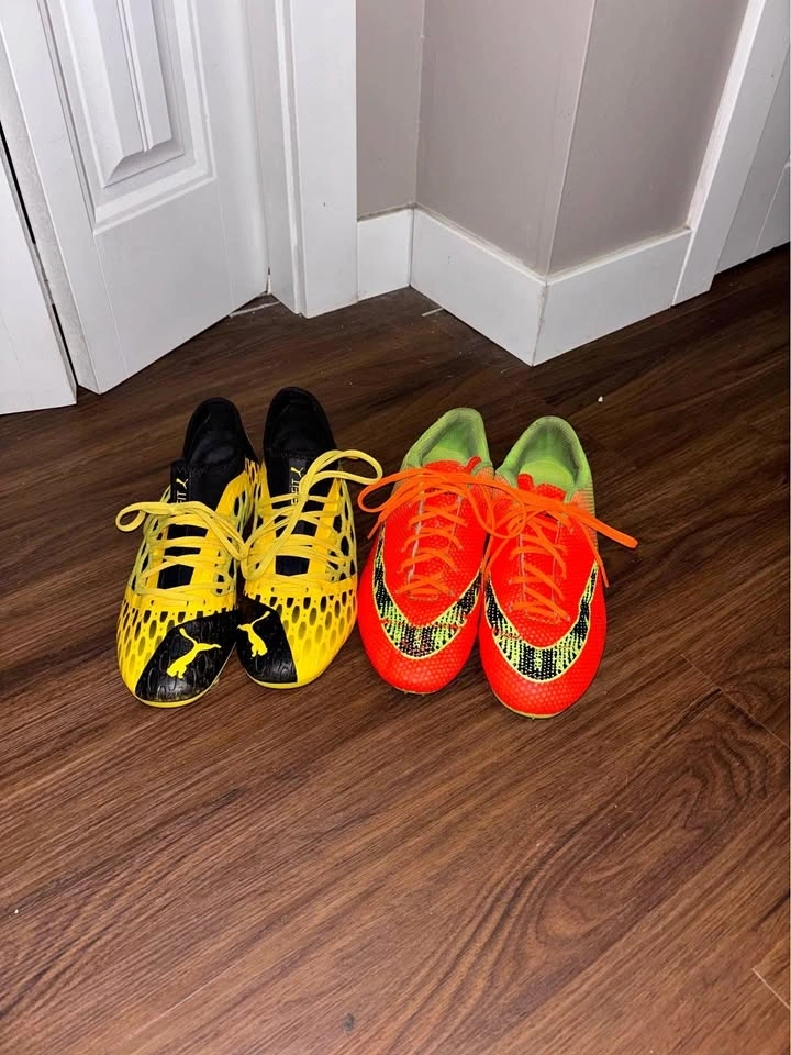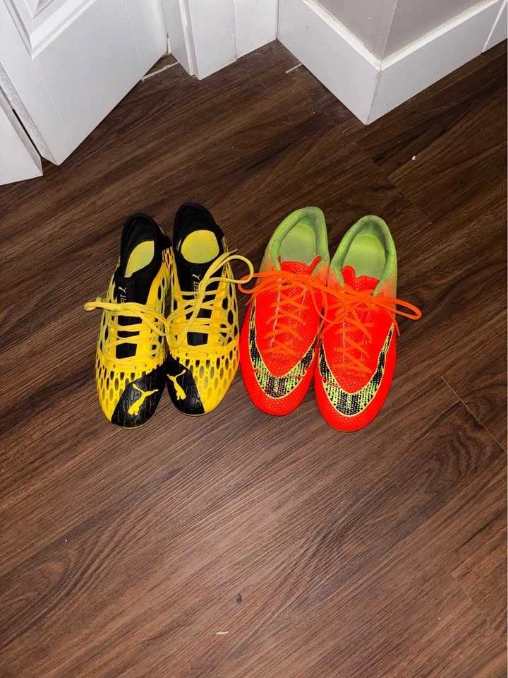 Both have only been worn for a season or two as we've outgrown them and no longer play soccer. Orange ones are size 7.5 and yellow ones are size 8. Let me know if you're interested!
