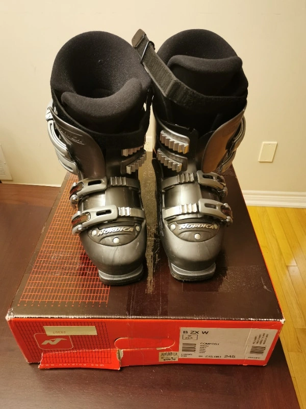 Well kept ladies’ Ski Boots in size 24.5 (280mm)! An once-worn pair of sliver gray Nordica BZX Ski Boots in excellent condition. Super clean inside and out. Made in Hungary. Great ski boots nicely padded. Comfortable and warm. Pick up at Canadian Tire parking lot near Yonge St and Tower Hill Rd. Cash accepted.