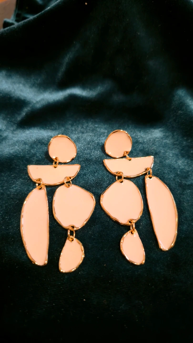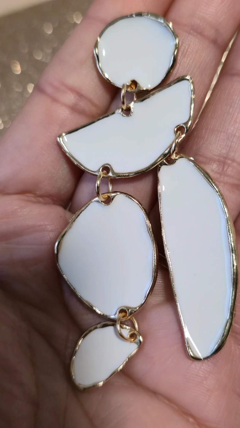 Stylish geometric dangle earrings with a mix of shapes. Gold-tone metal with white enamel inlay. These earrings offer a unique, artistic look.