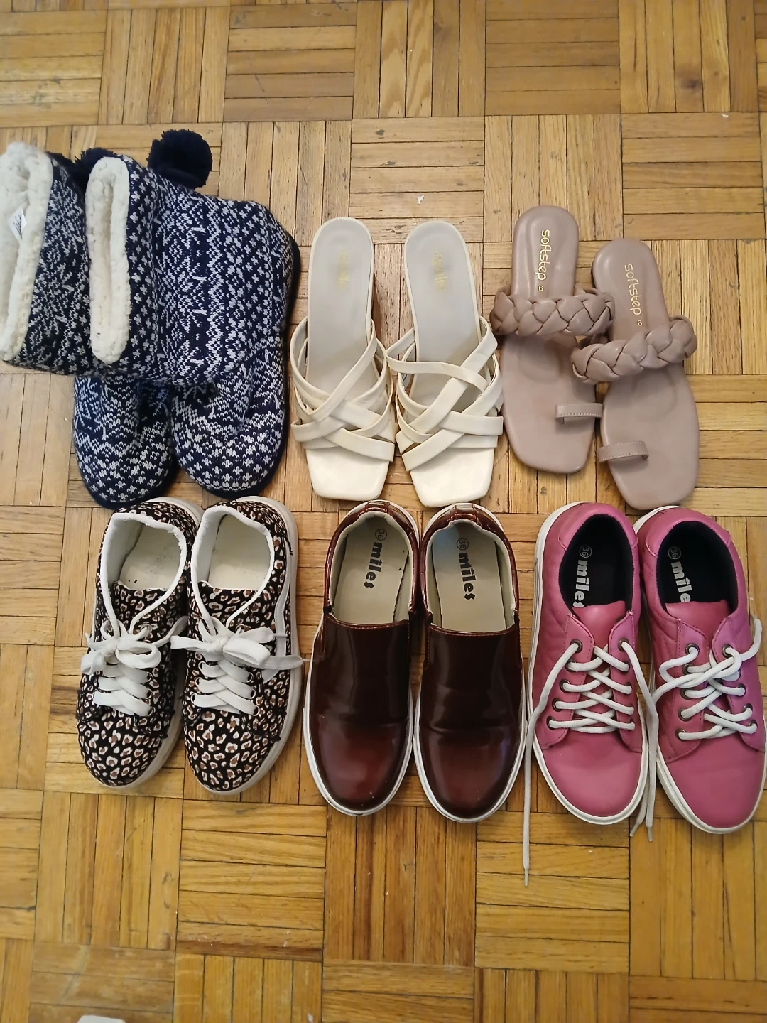 Includes a pair of patterned low-top sneakers, two pairs of casual slip-on shoes, and a pair of pink sneakers. Also includes a pair of cream strappy sandals and beige slide sandals with braided detail. Additionally, a pair of cozy knit slipper boots with fleece lining.