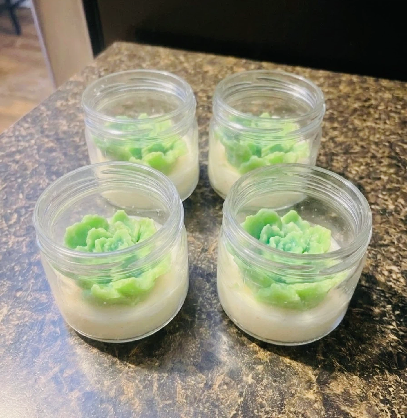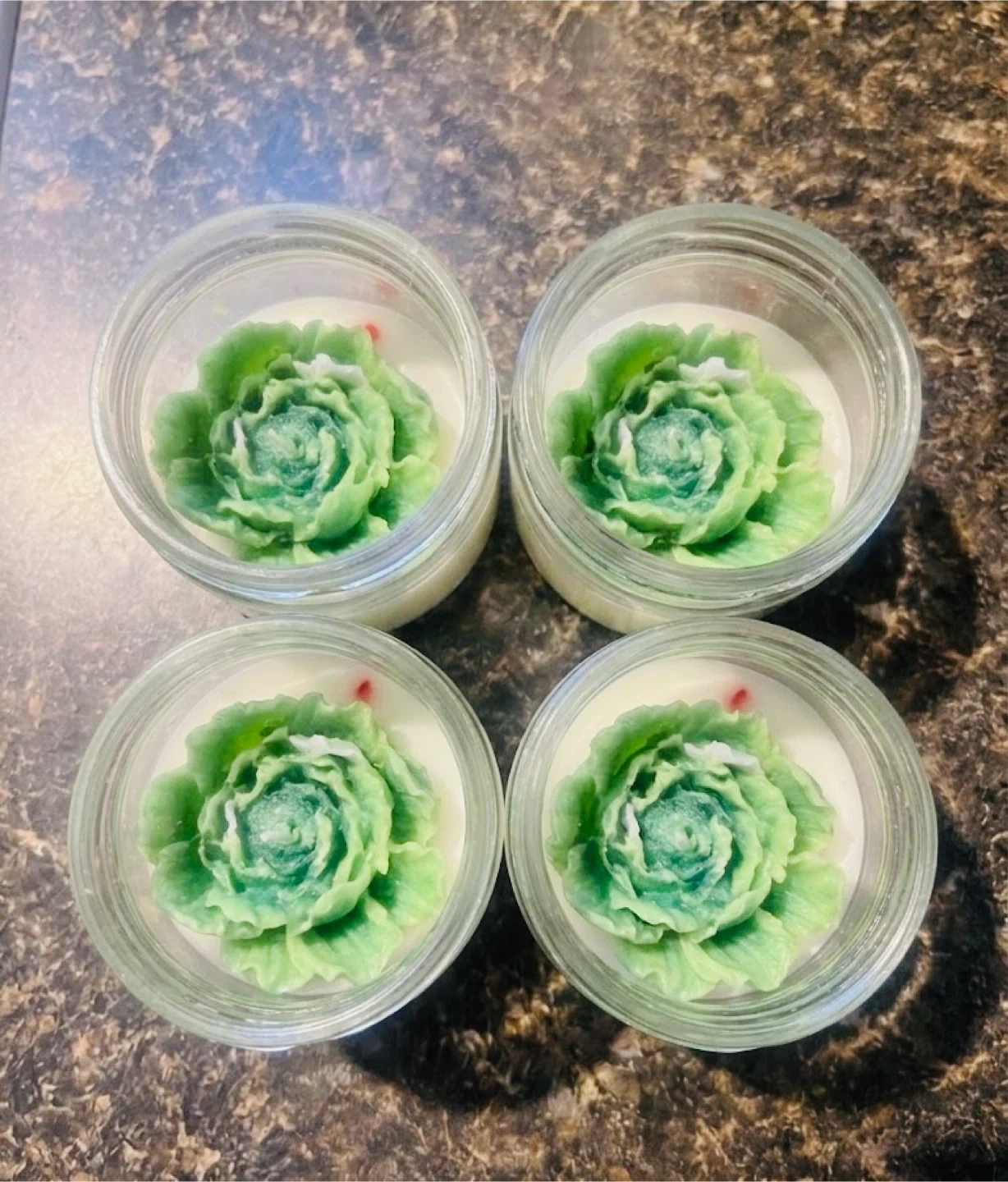 A pack of 4 $20 . Beautiful handmade mini candles with green flower tops, perfect for celebrating St. Patrick’s Day. These cute candles make great gifts, party favors, or decorations for your holiday table.
