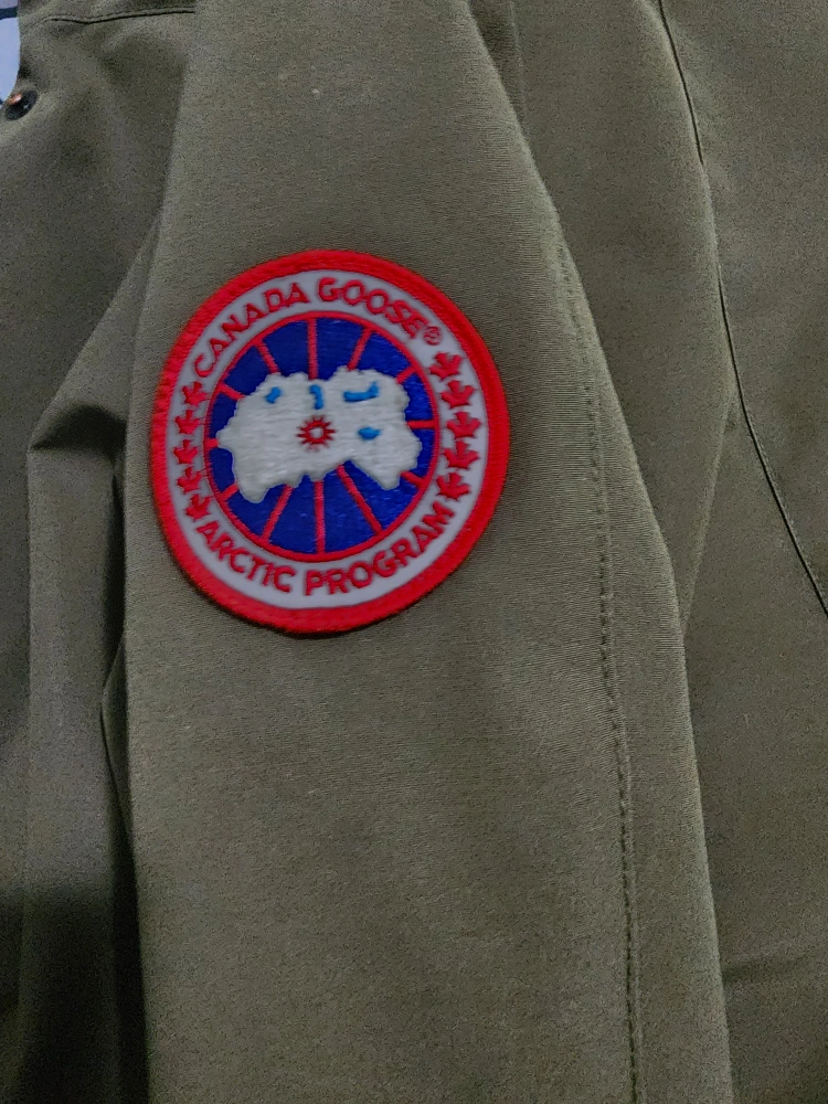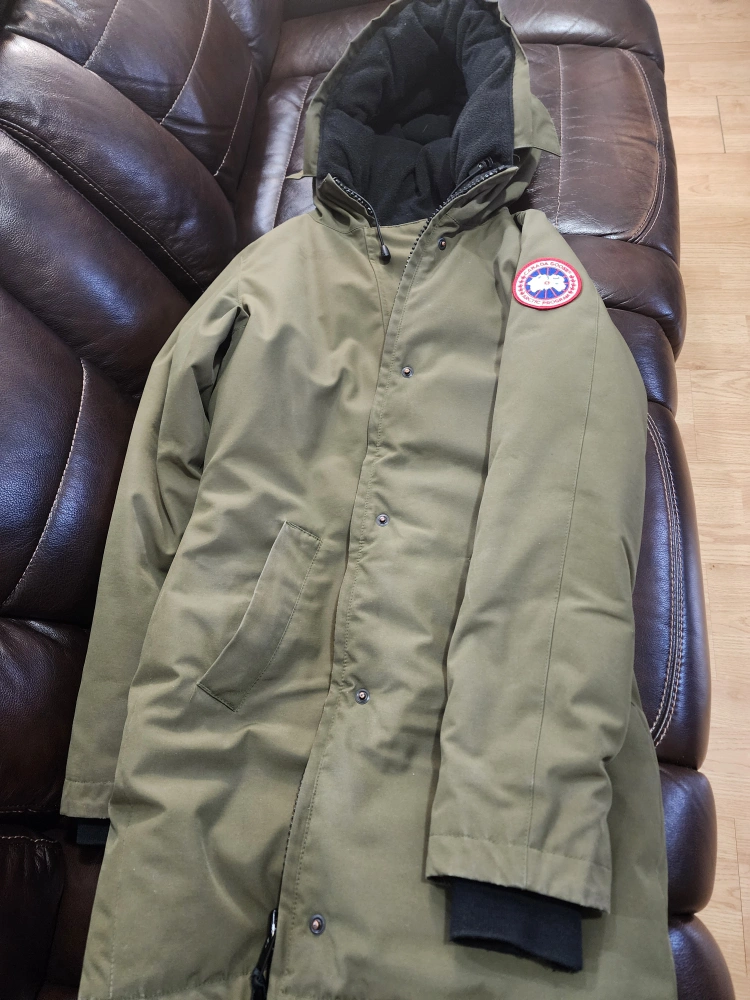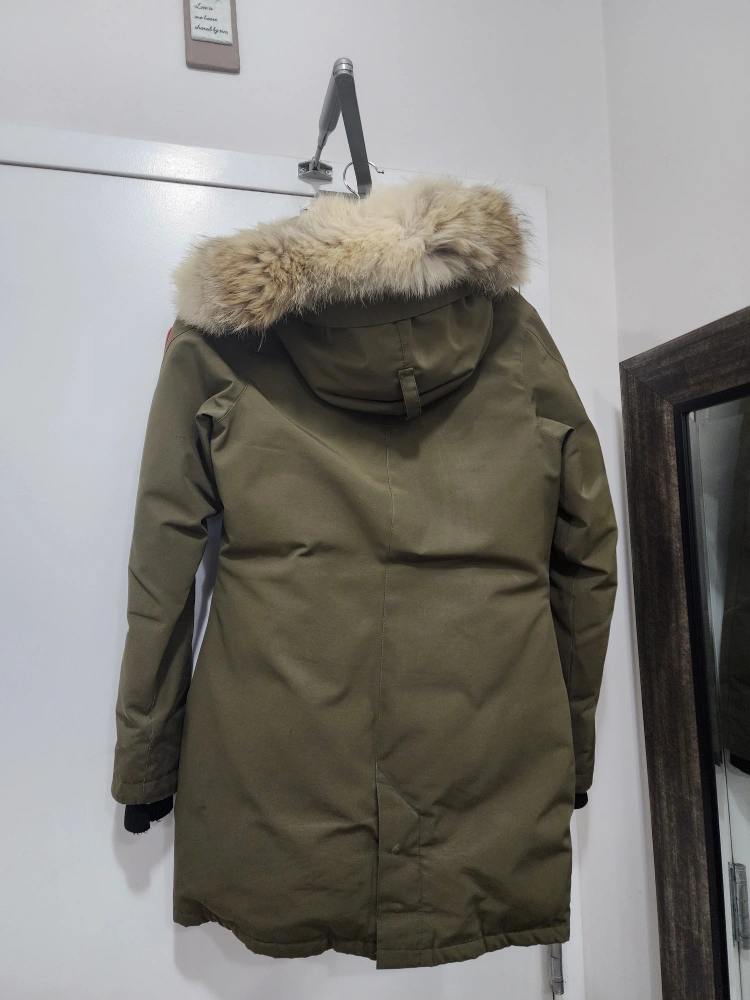 Canada Goose down-filled parka jacket in a military green colour. It's a size small women with a fur-lined hood. This warm jacket is great for the colder months! Also includes a Canada Goose toque