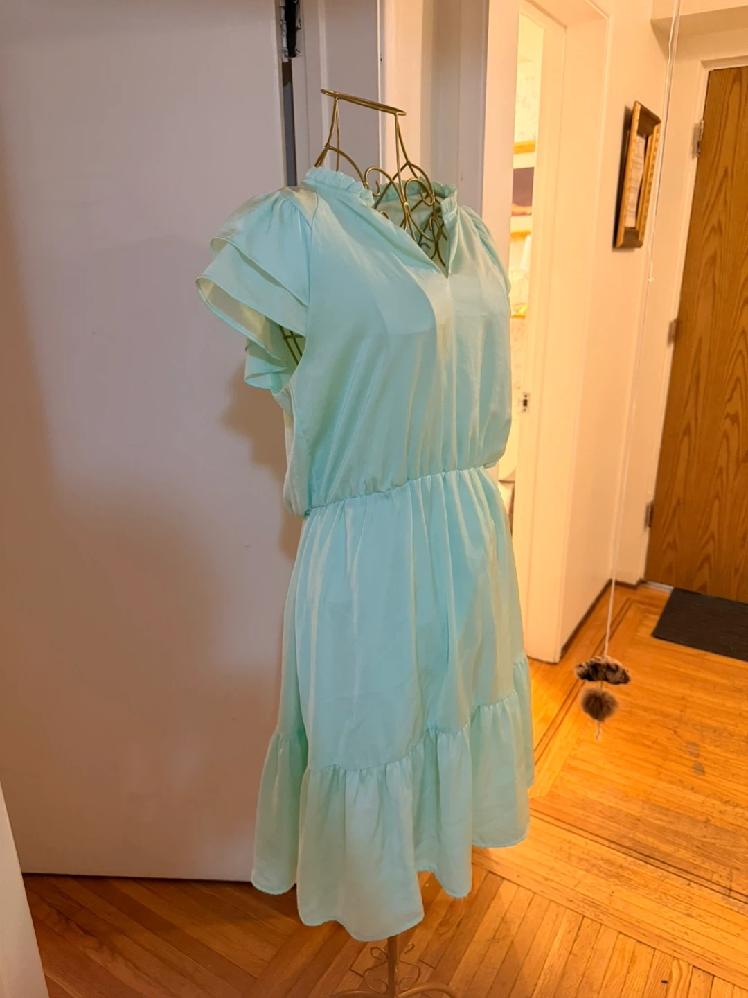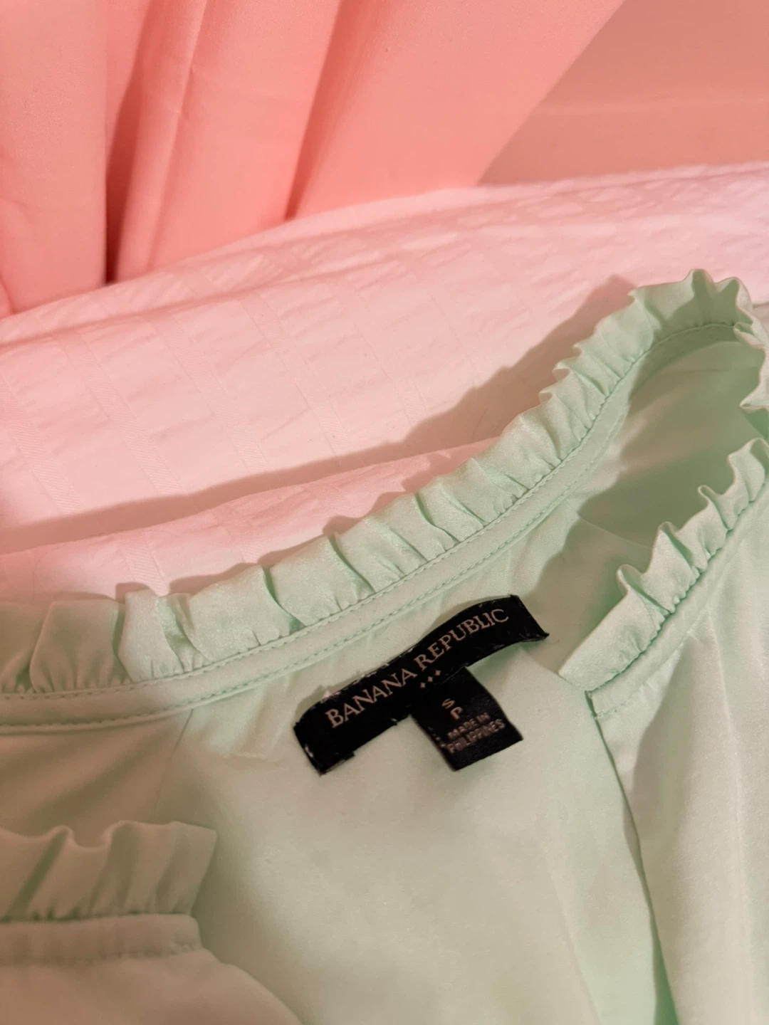 Mint green Banana Republic dress with a ruffled neckline and tiered hem. It's a small, size petite and made of a light, flowing material. This dress is perfect for spring or summer occasions! Super elegant