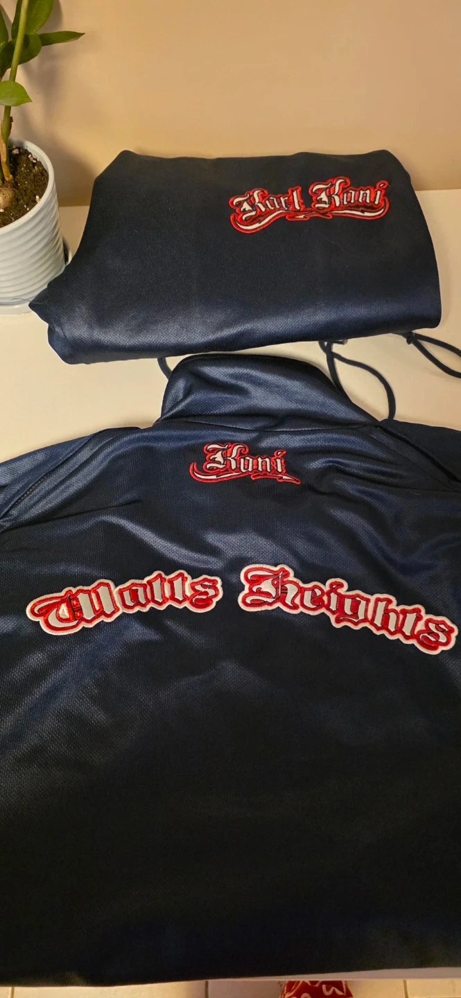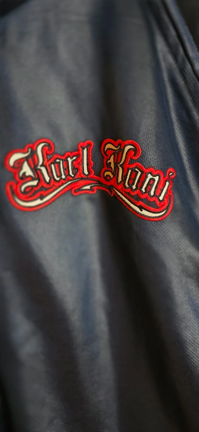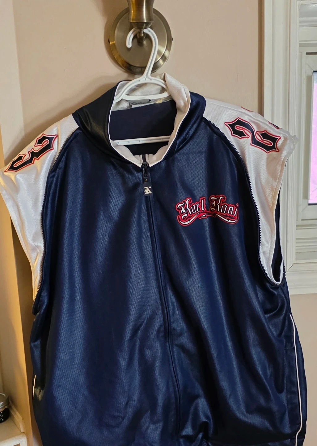Karl Kani original citywear track jacke and matching pants in navy blue and white. Removable sleeves with full zip closure. Features embroidered Karl Kani logo on the chest and sleeve accents.