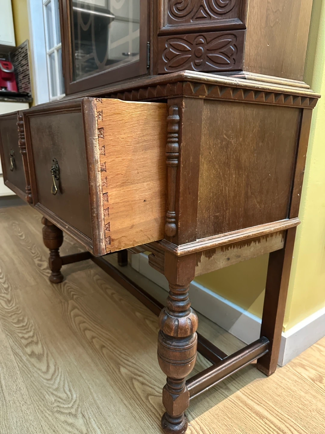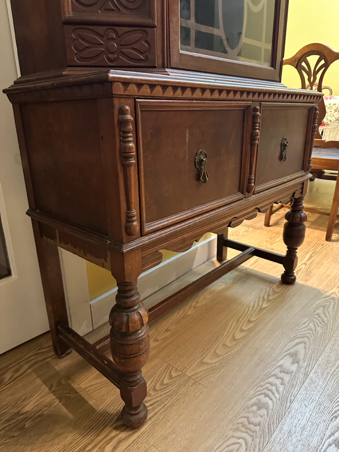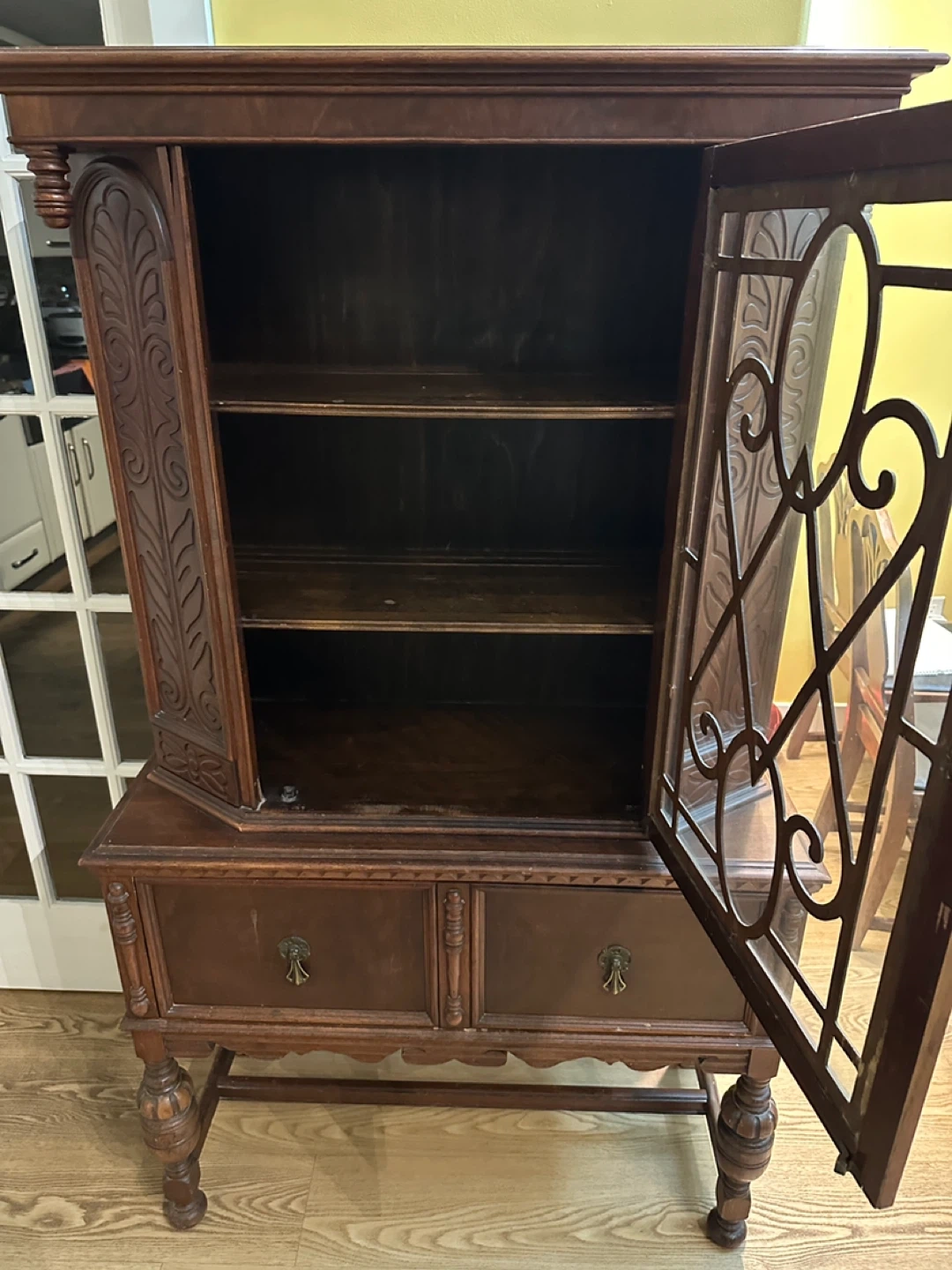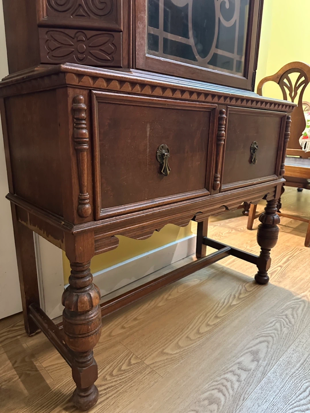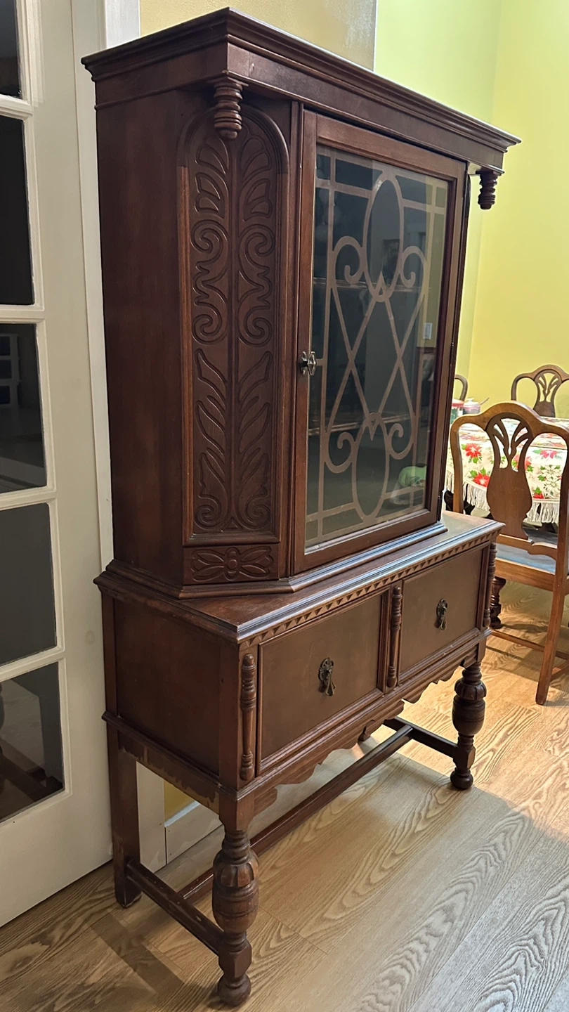 Beautifully crafted Antique china cabinet featuring rich wood tones, classic carved detailing, and a decorative leaded-style glass door. A timeless statement piece that adds warmth and sophistication to any dining room, living space, or entryway.