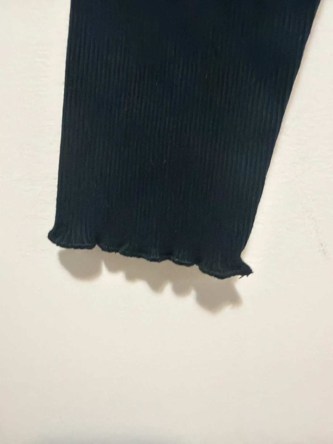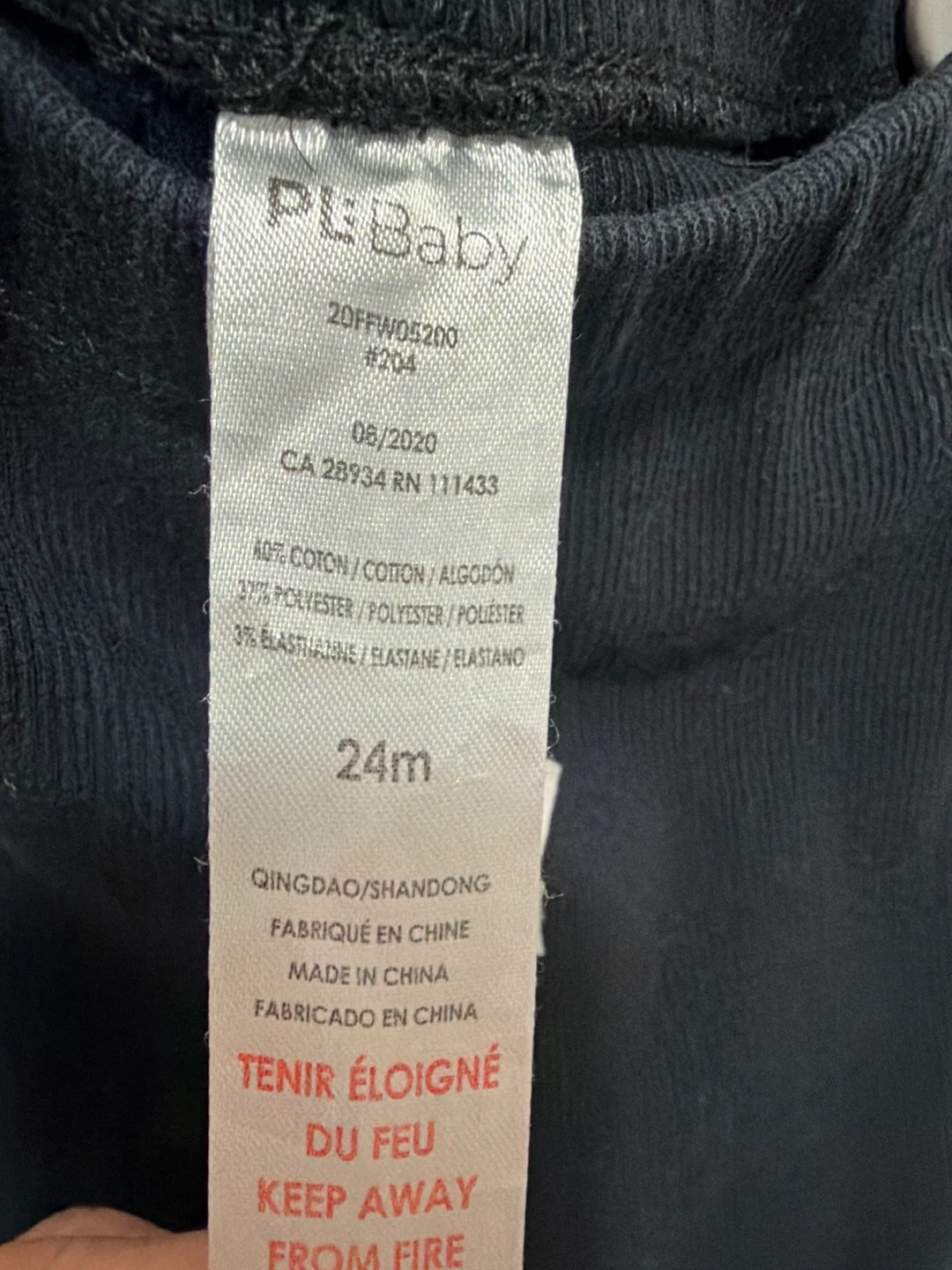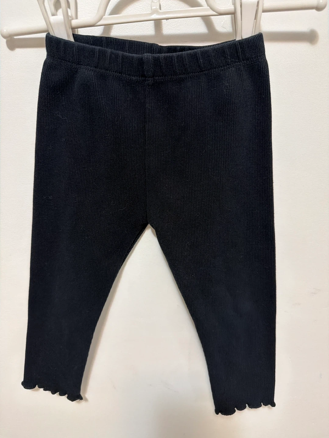 These black PLBaby leggings are made from a ribbed knit fabric. They feature a comfortable elastic waistband and lettuce trim at the ankles. Fabric is 60% cotton, 37% polyester, and 3% elastane.