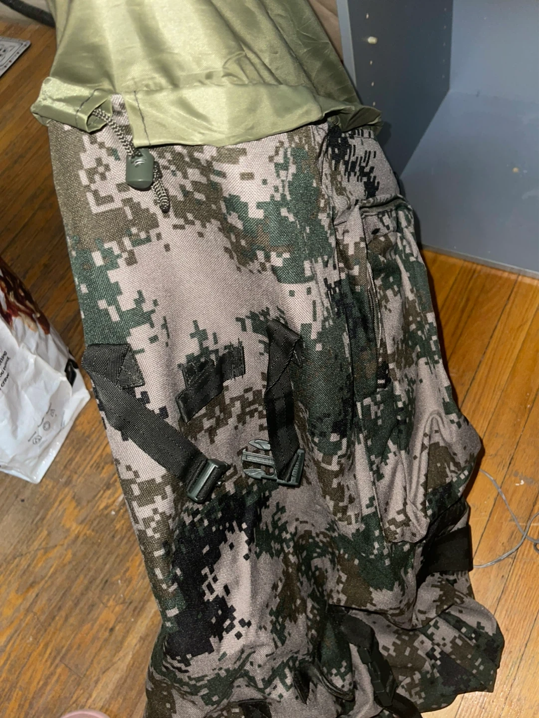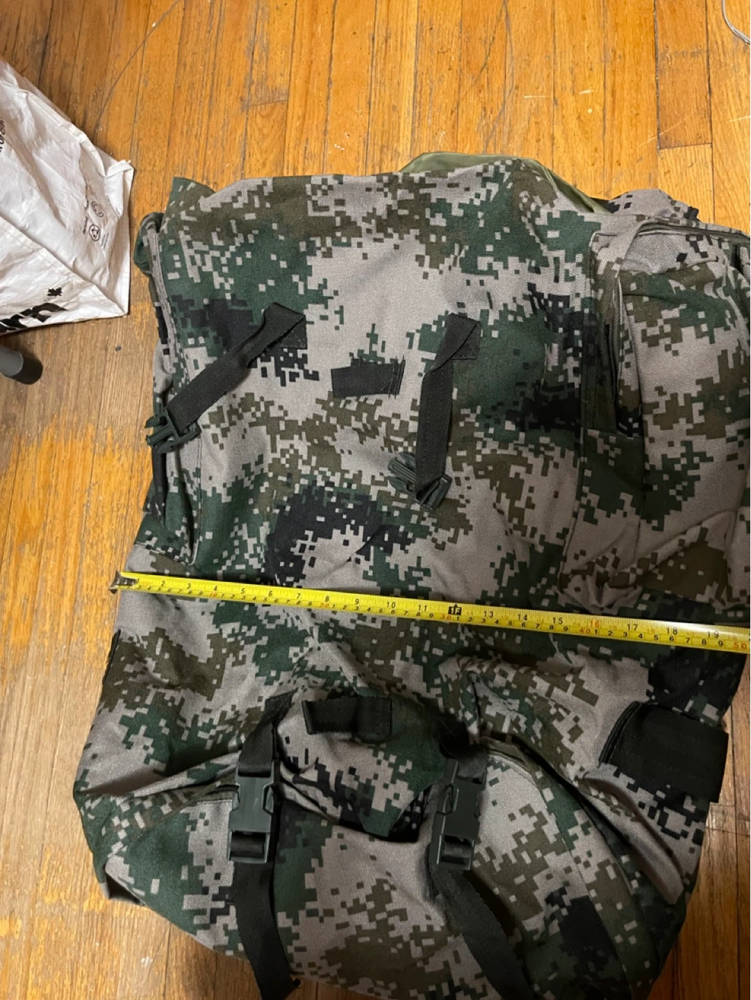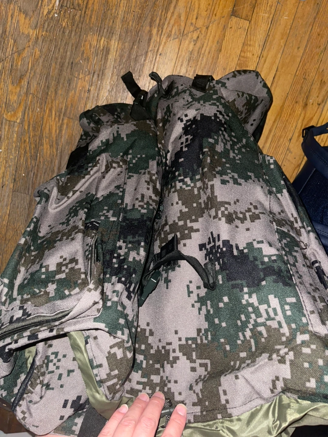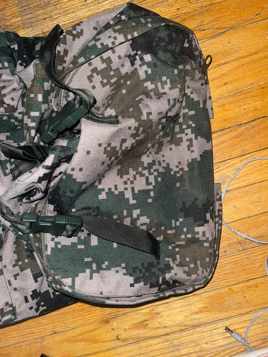 A camouflage backpack with multiple compartments. It has adjustable straps and a durable exterior.