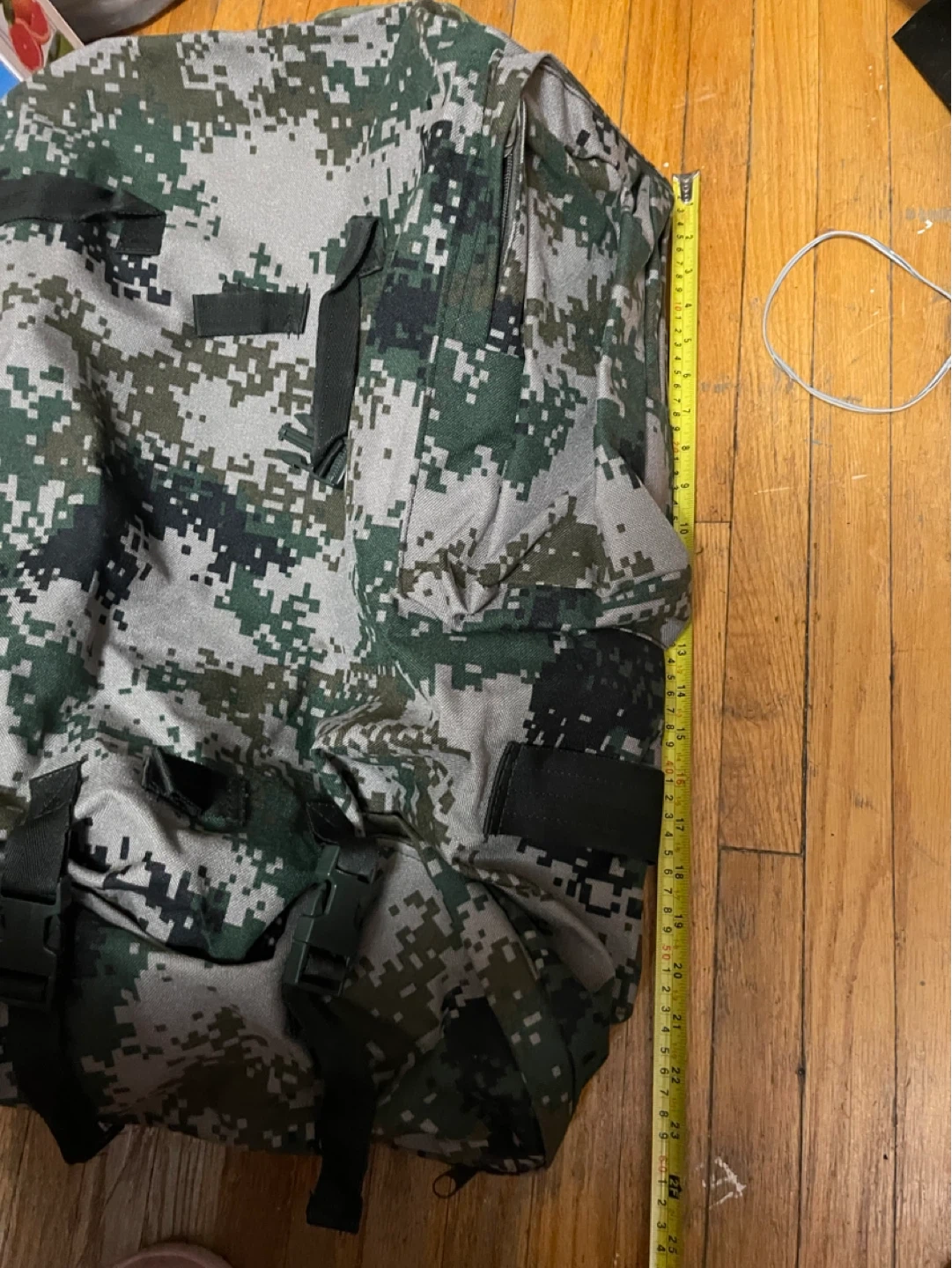 Check photos for measurements. The measurements are about. Didn’t really stretch the fabric of the bag.