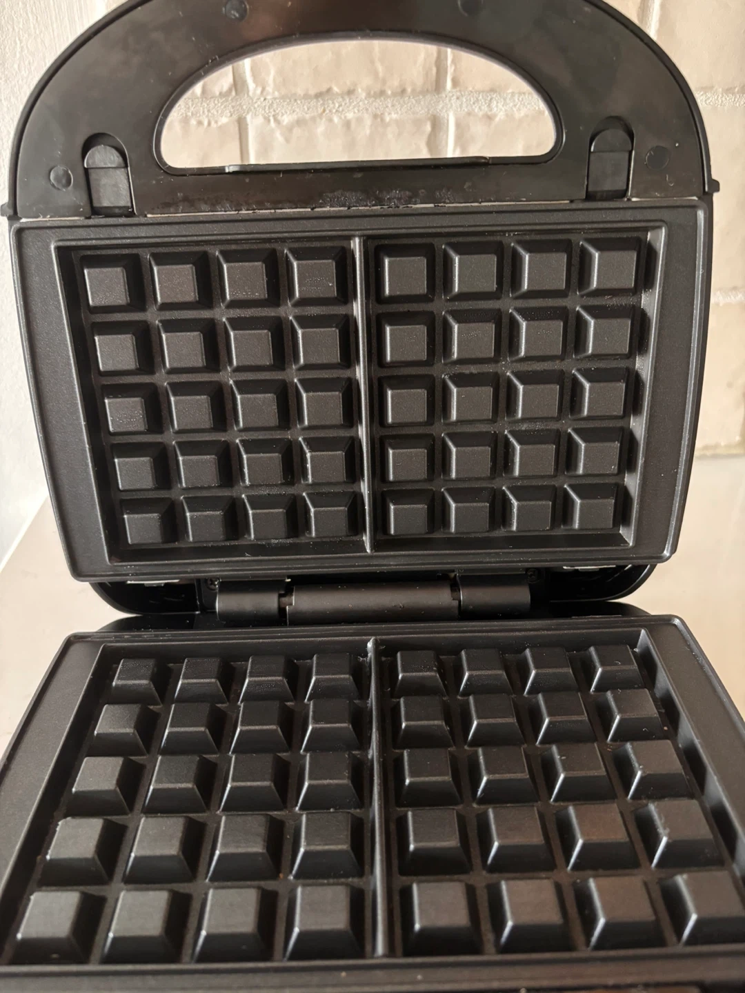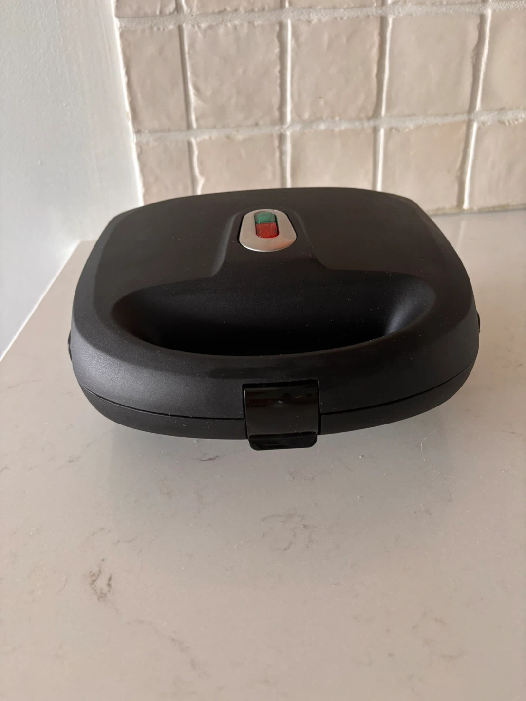 Compact electric waffle maker that’s easy to use and perfect for making waffles or sandwiches at home. Includes interchangeable plates for waffles and sandwiches, heating evenly for quick results