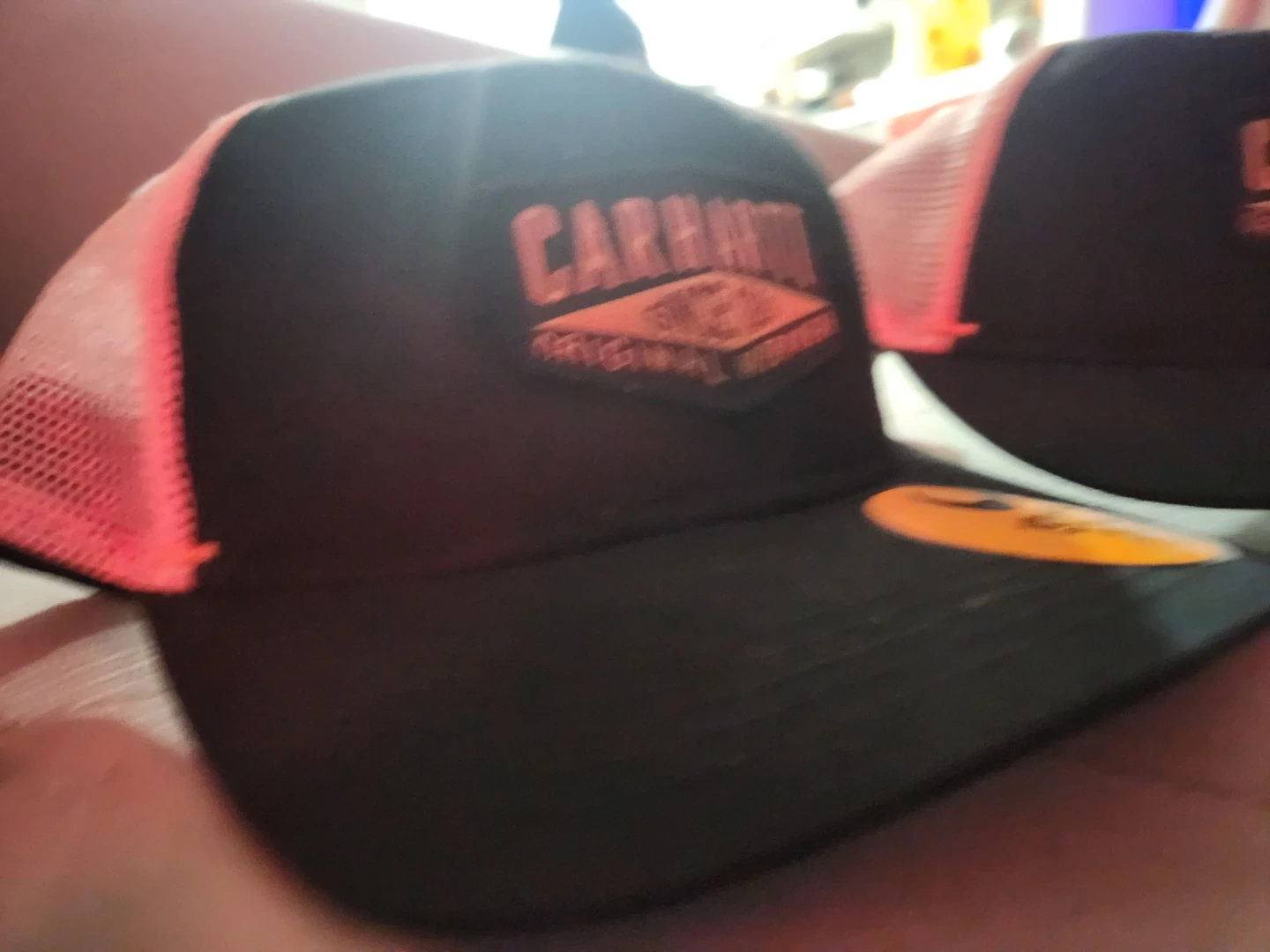 Two Carhartt trucker hats are up for grabs! These black caps feature the iconic Carhartt logo patch and a pink mesh back. They're perfect for everyday wear or while working outdoors. Selling 10 each or 2 for 30
