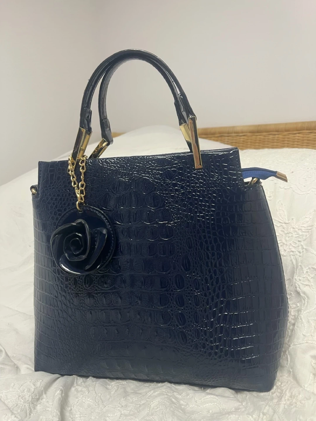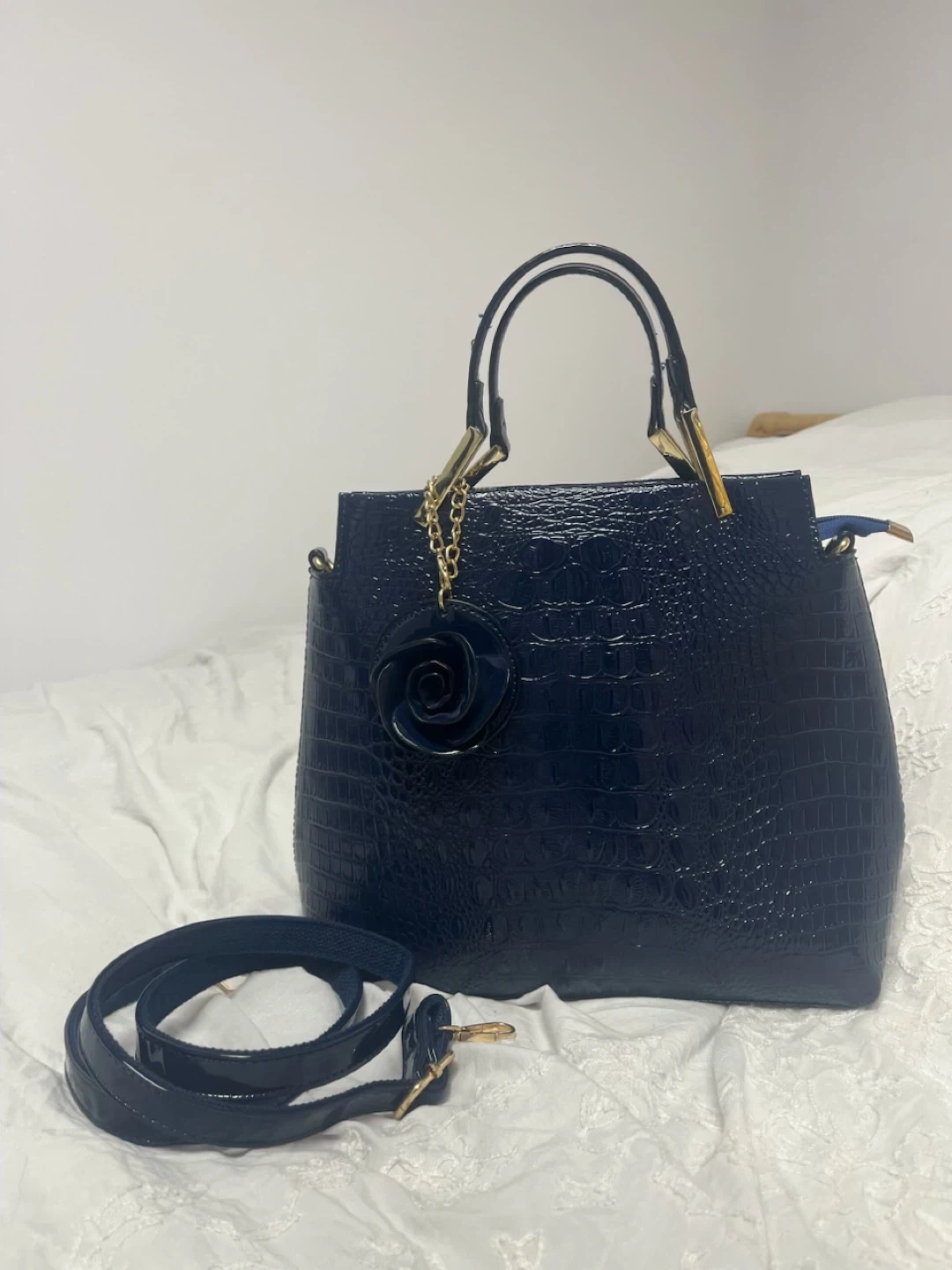 This navy blue handbag features a stylish crocodile embossed texture. It comes with a detachable shoulder strap and a decorative rose charm. Interior is lined. Pick up cash only