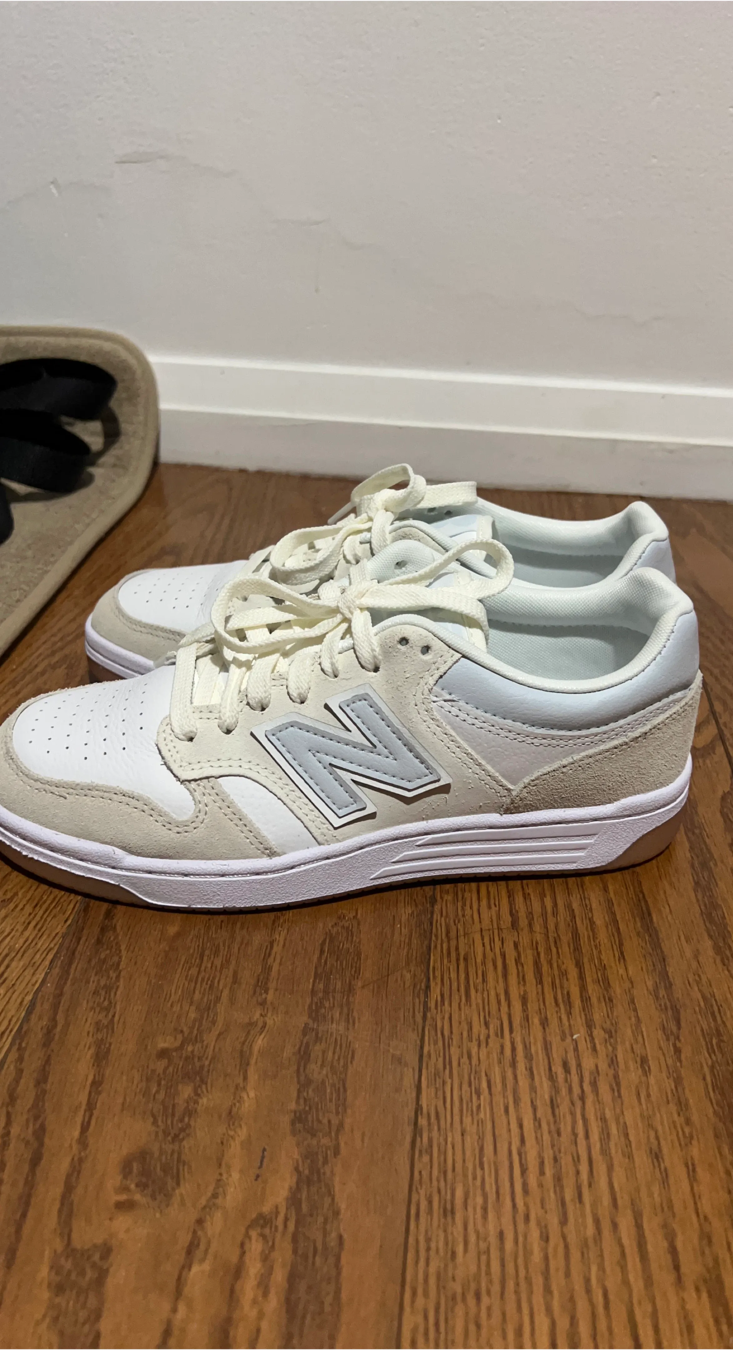 These are white and light grey New Balance sneakers. They're made with a mix of leather and suede materials. Perfect for casual wear!