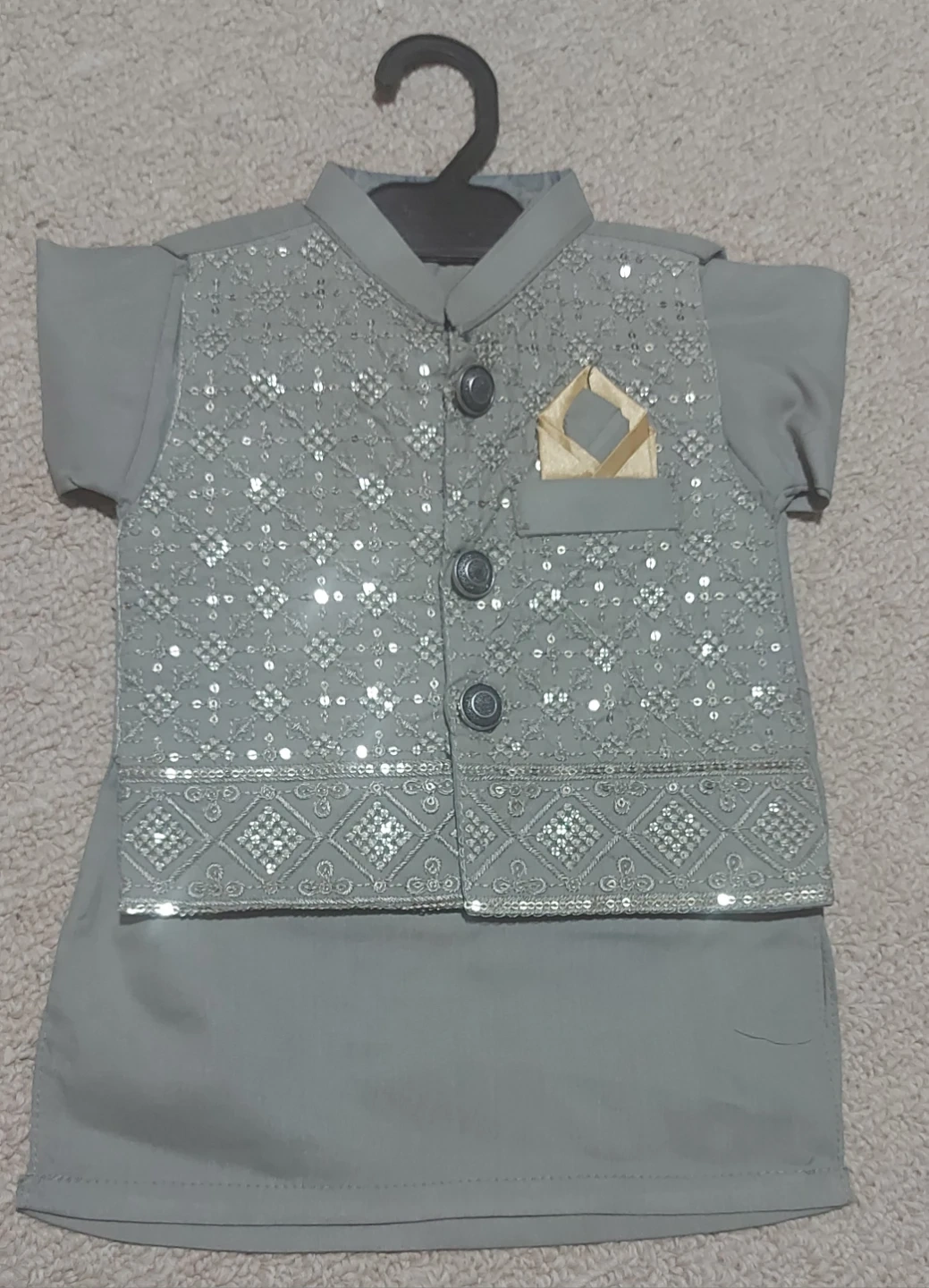 This is a stylish kids' grey outfit featuring a sequined vest over a kurta. It has a pocket square detail on the vest and button closures. The fabric appears to be a smooth