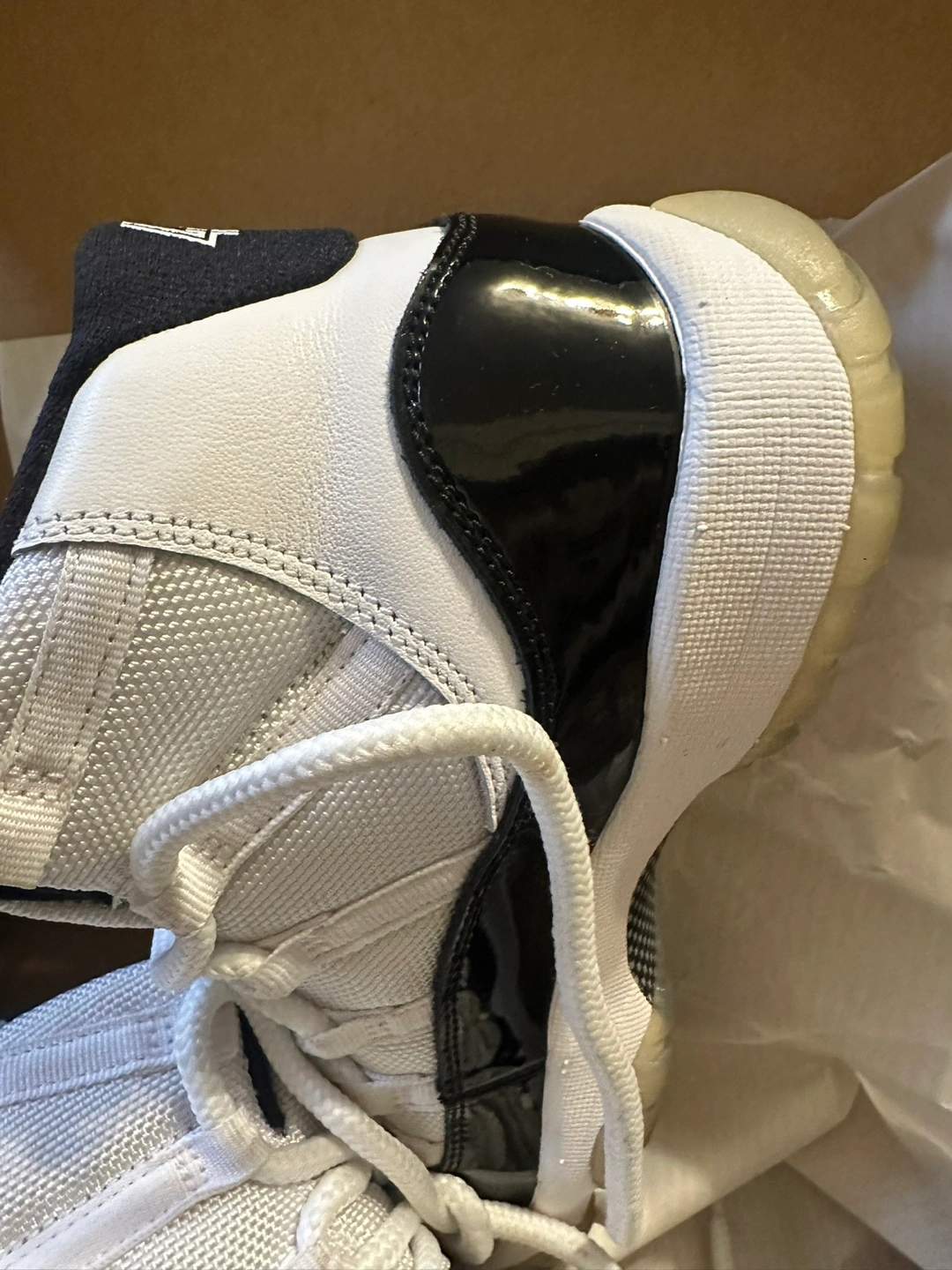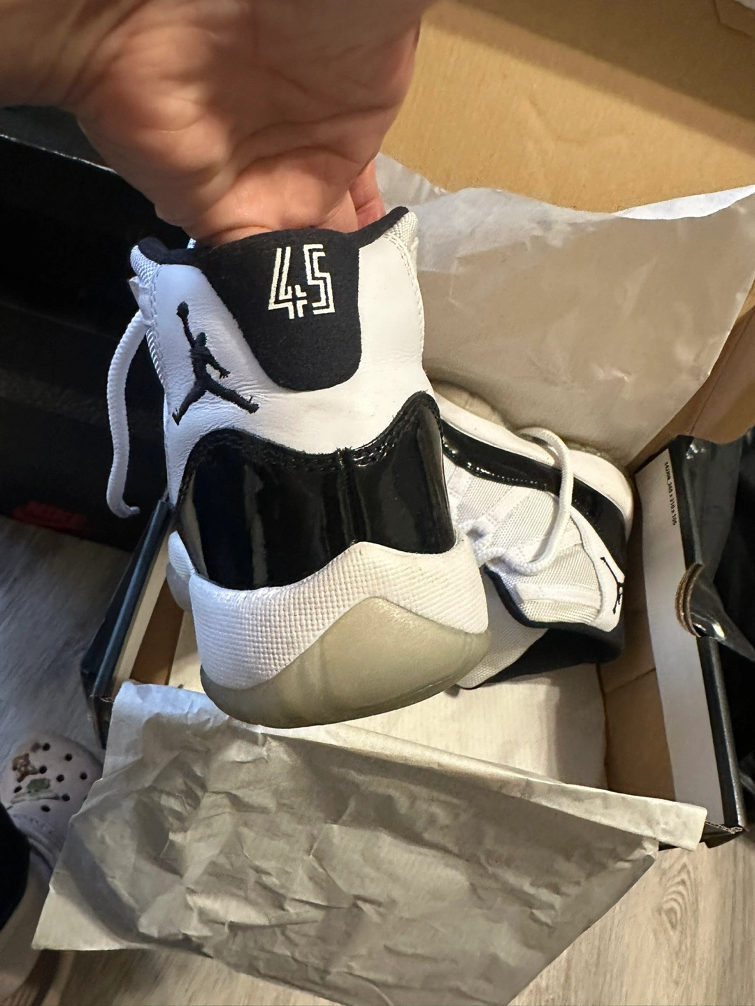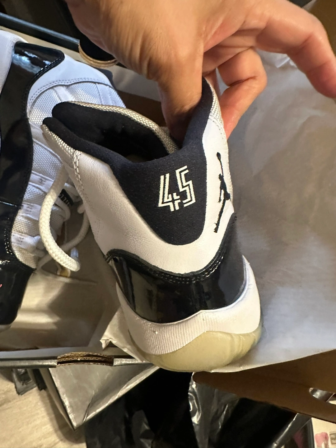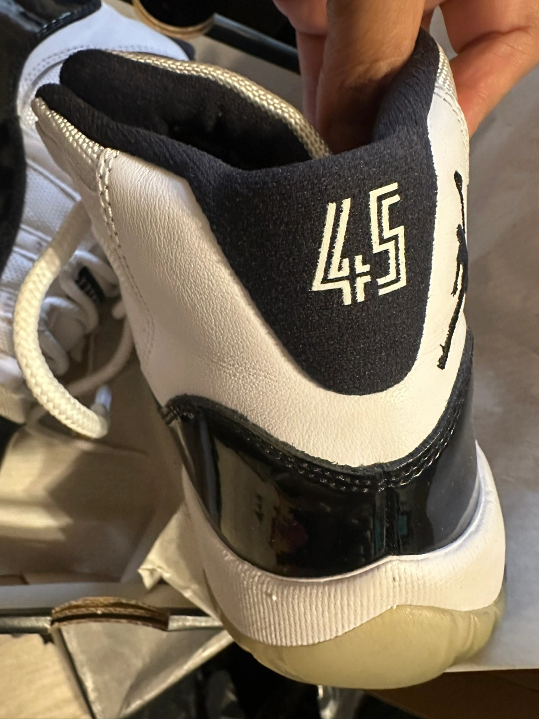 These Air Jordan 11 Retro shoes feature the iconic "Concord" colorway with a white mesh upper and black patent leather accents. The "45" on the heel signifies a special detail. Comes with the original box.