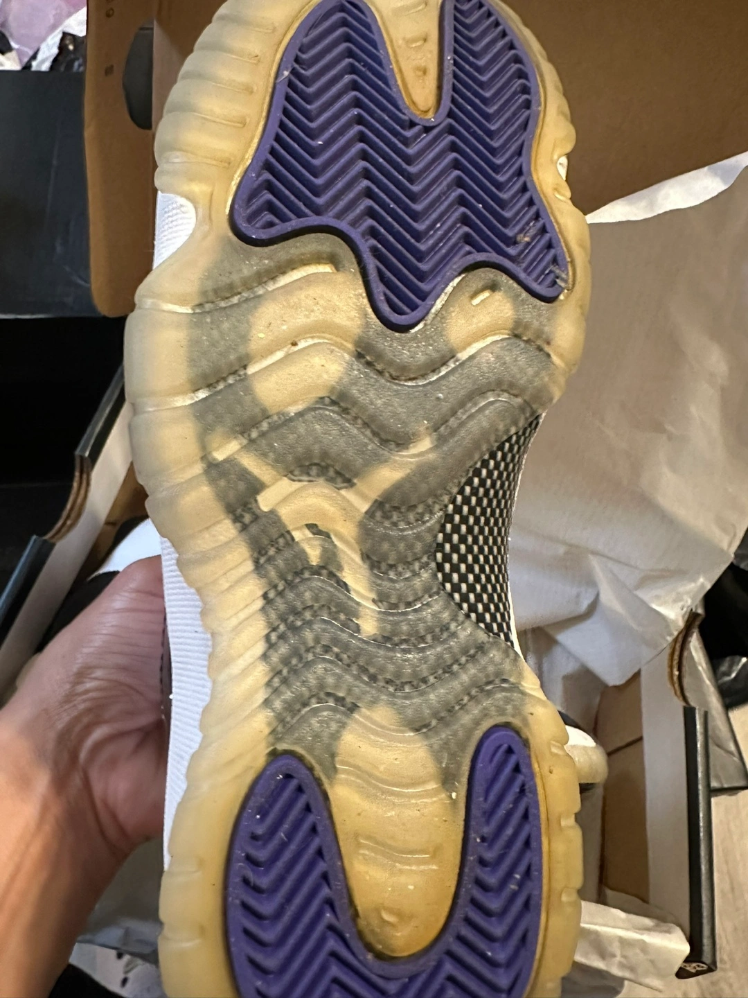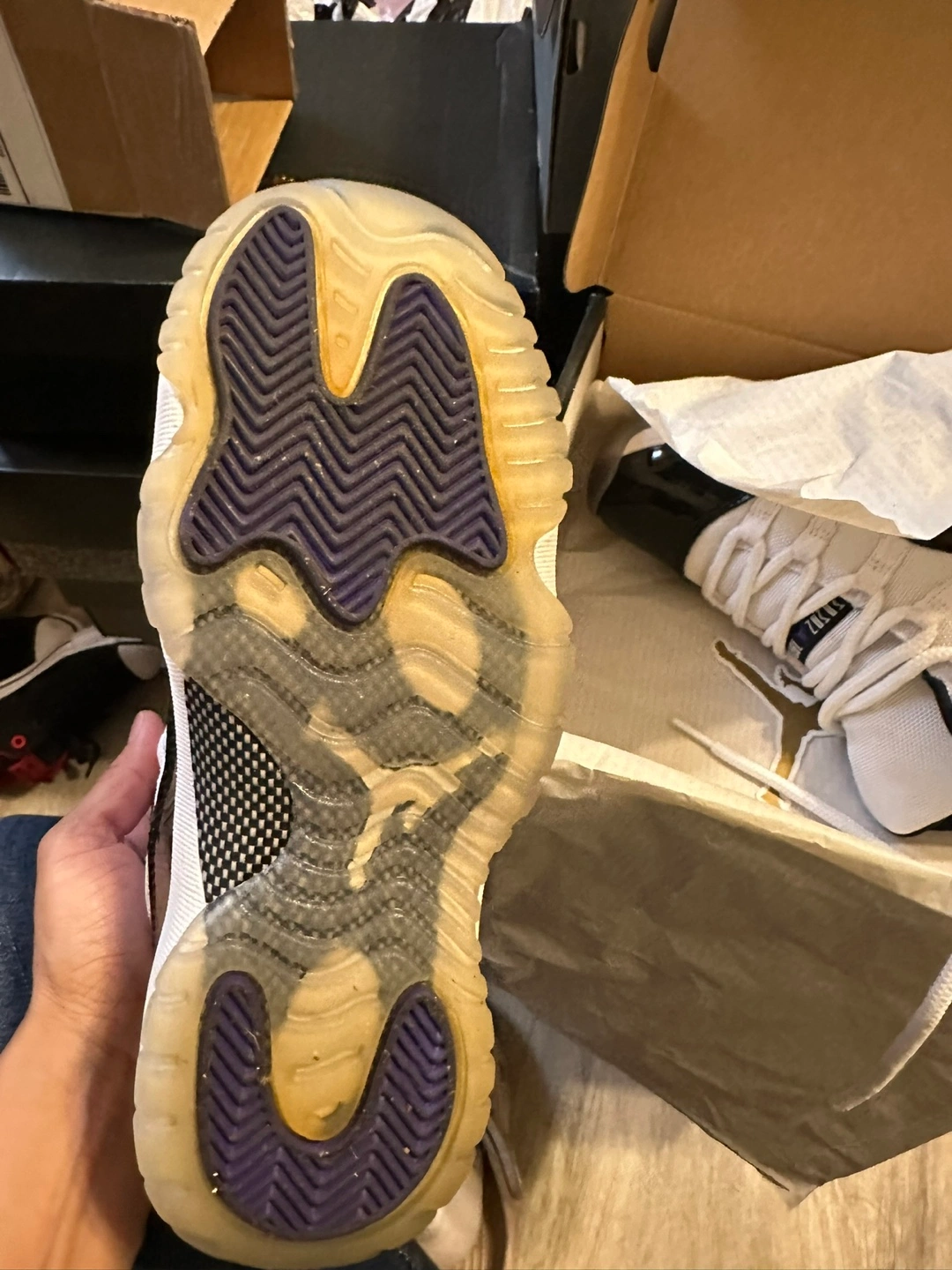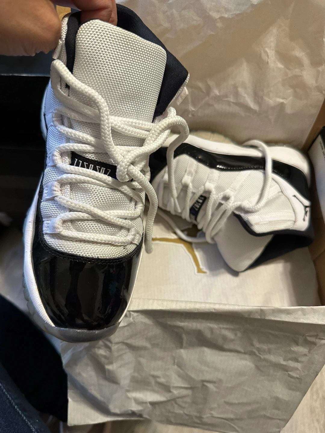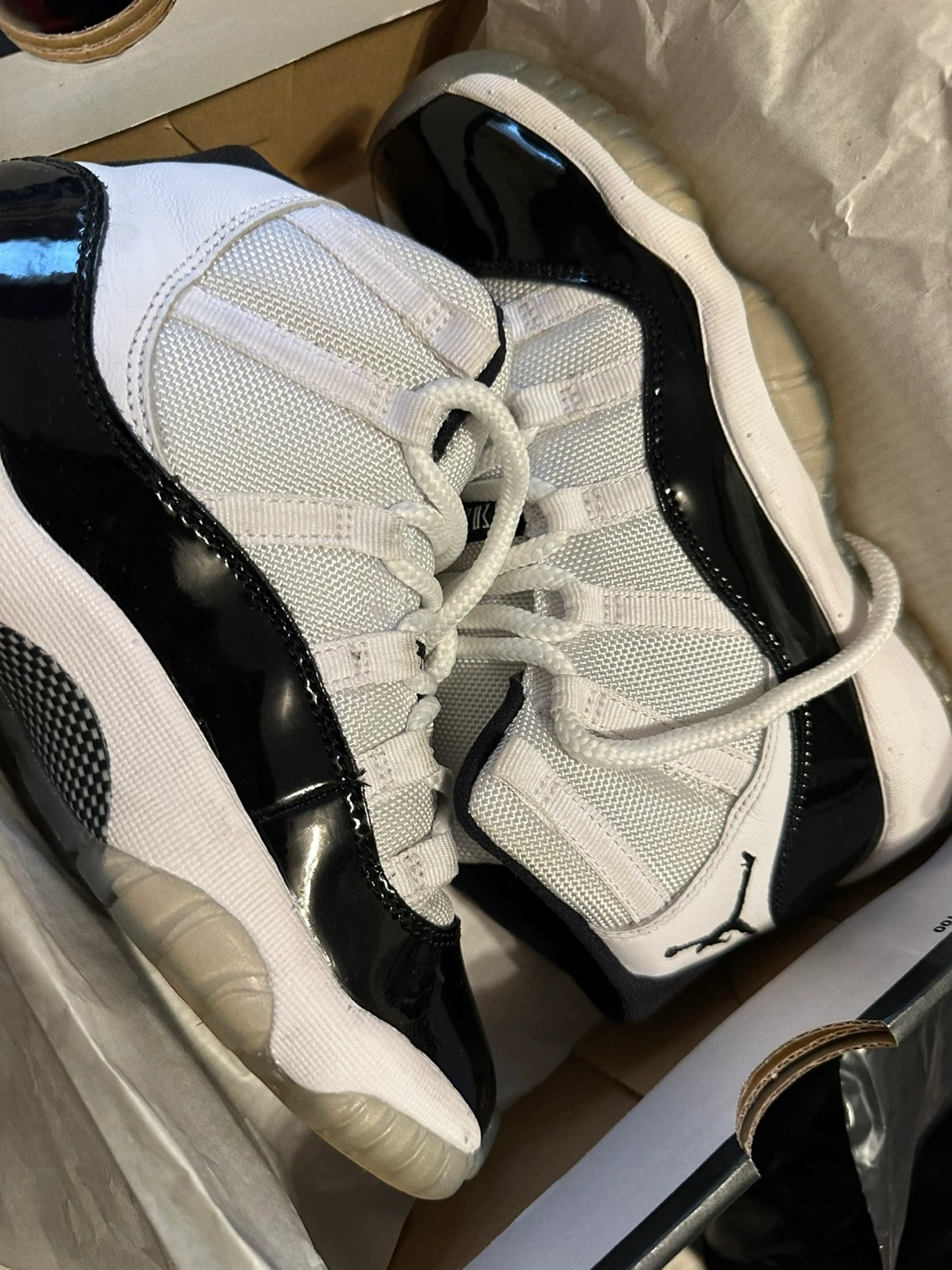 These Air Jordan 11 Retro shoes feature the iconic "Concord" colorway with a white mesh upper and black patent leather accents. The "45" on the heel signifies a special detail. Comes with the original box.