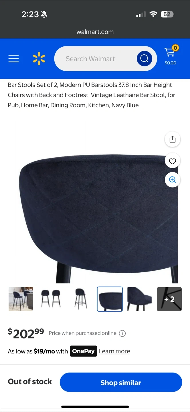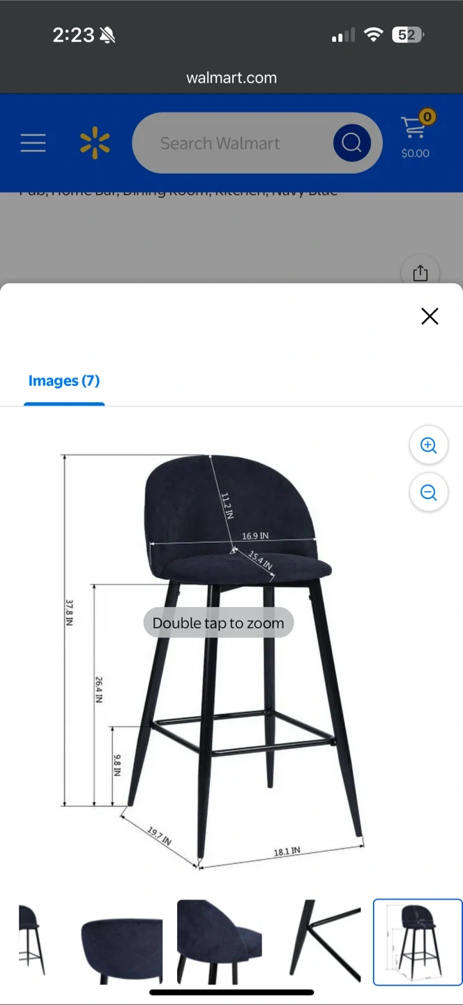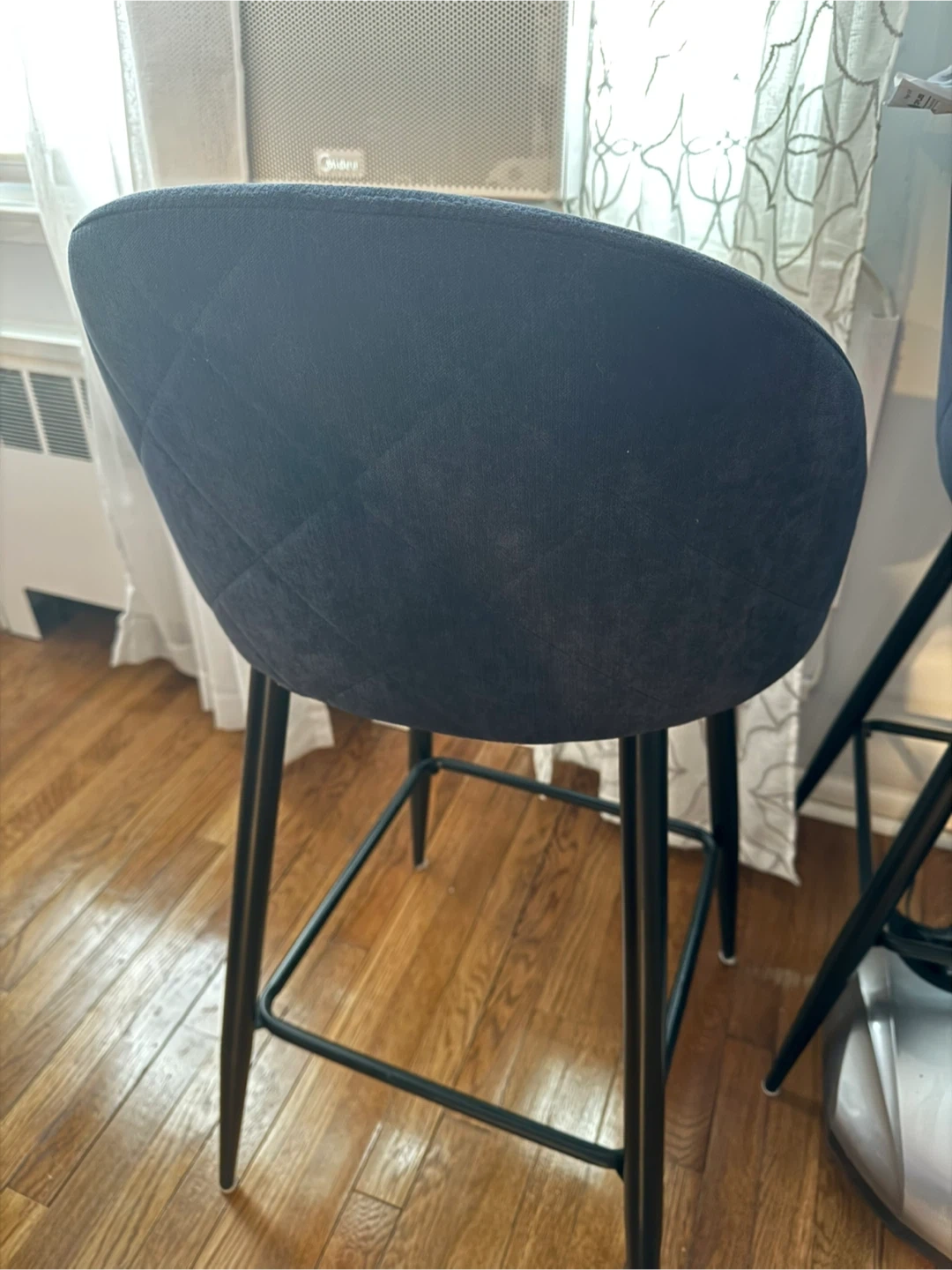 Selling a set of 2 bar stools in navy blue! It's a modern PU barstool with a back and footrest. The height is 37.8 inches, perfect for a pub, home bar, dining room, or kitchen. The dimensions are visible in the screenshots!