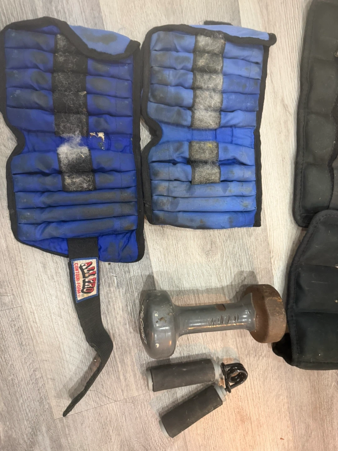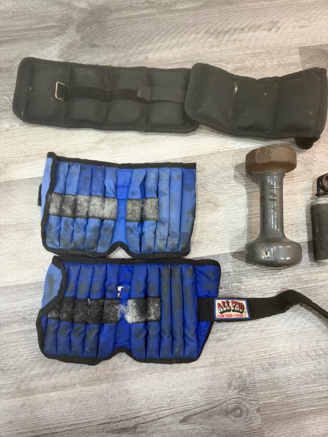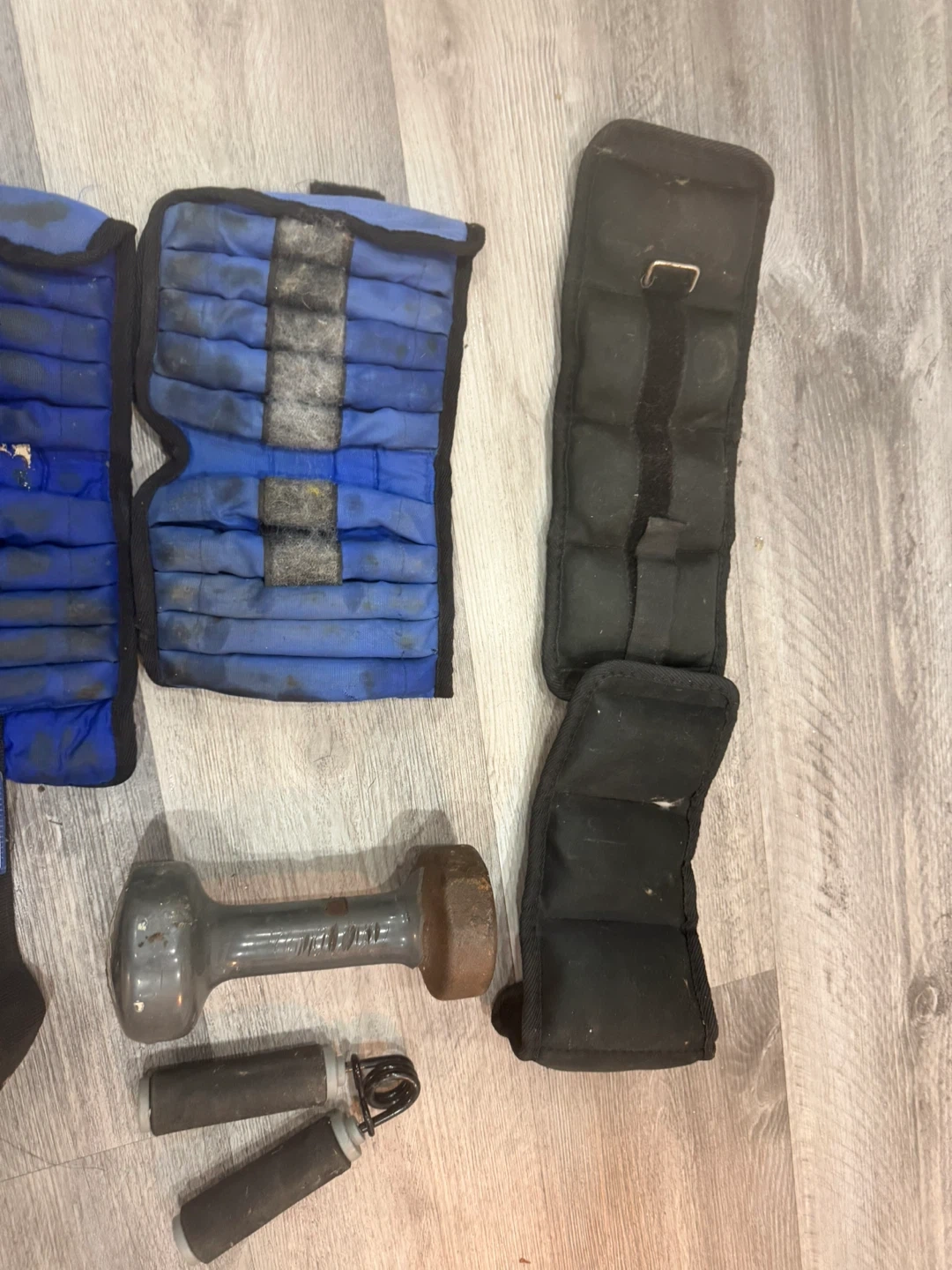 Includes a pair of blue weighted ankle/wrist weights and a single dumbbell. Weights are adjustable and have velcro straps. Great for adding resistance to workouts!